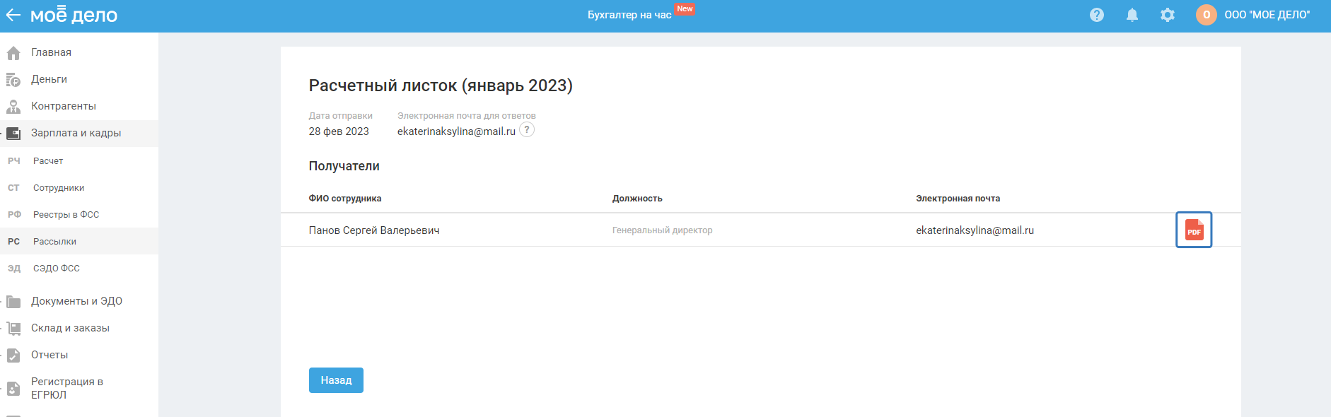 По завершённым отправкам вы можете скачать расчётный листок, для этого нажмите на название отправки, после чего в открывшемся окне справа от ФИО сотрудника нажмите на значок pdf.