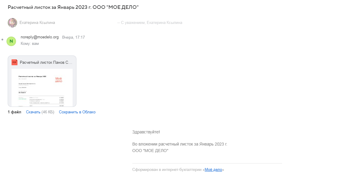 После создания рассылки сотрудник получит на свою эл. почту письмо с файлом расчётного листка во вложении следующего содержания.