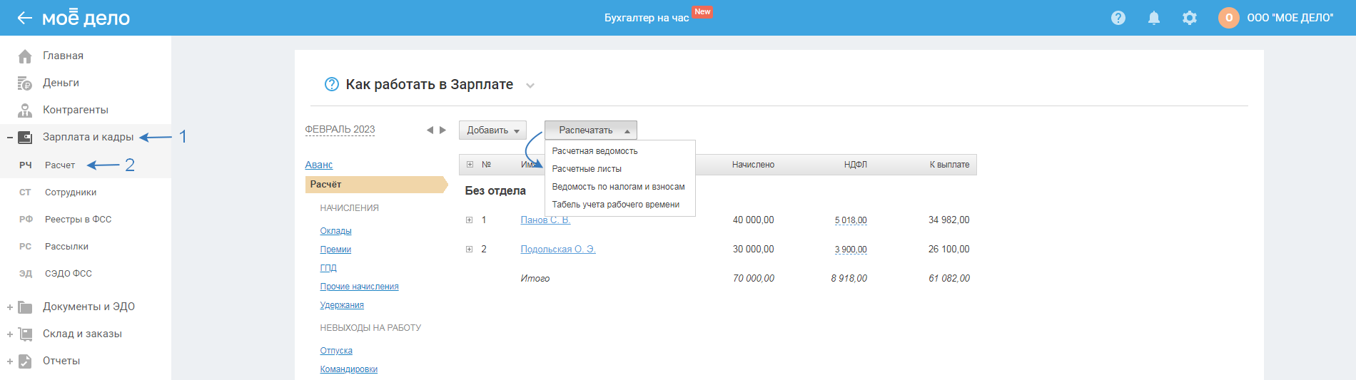 В блоке «Получатели» отображаются все сотрудники, оформленные в штат (проведённые с сервисе по трудовому договору).