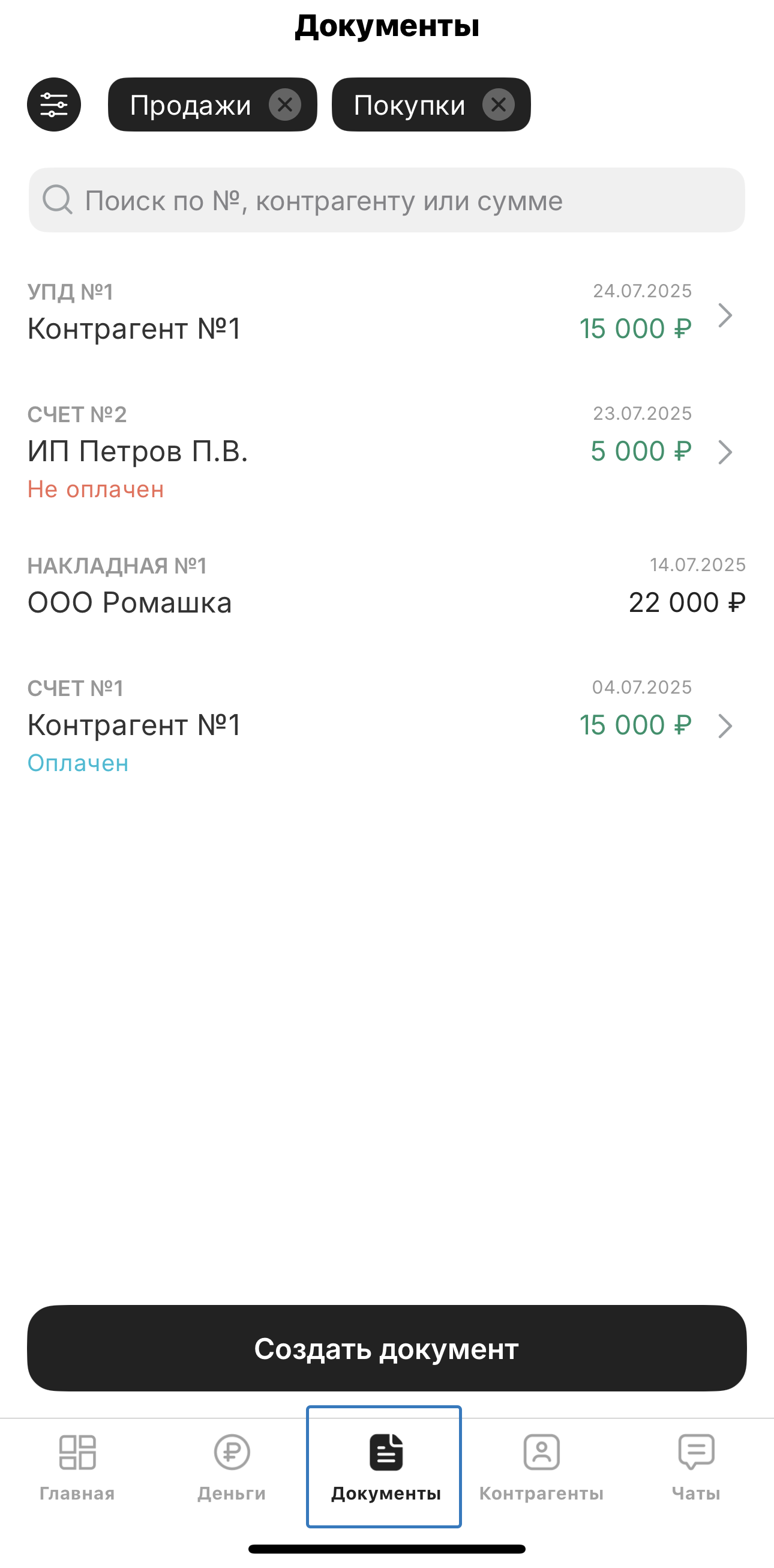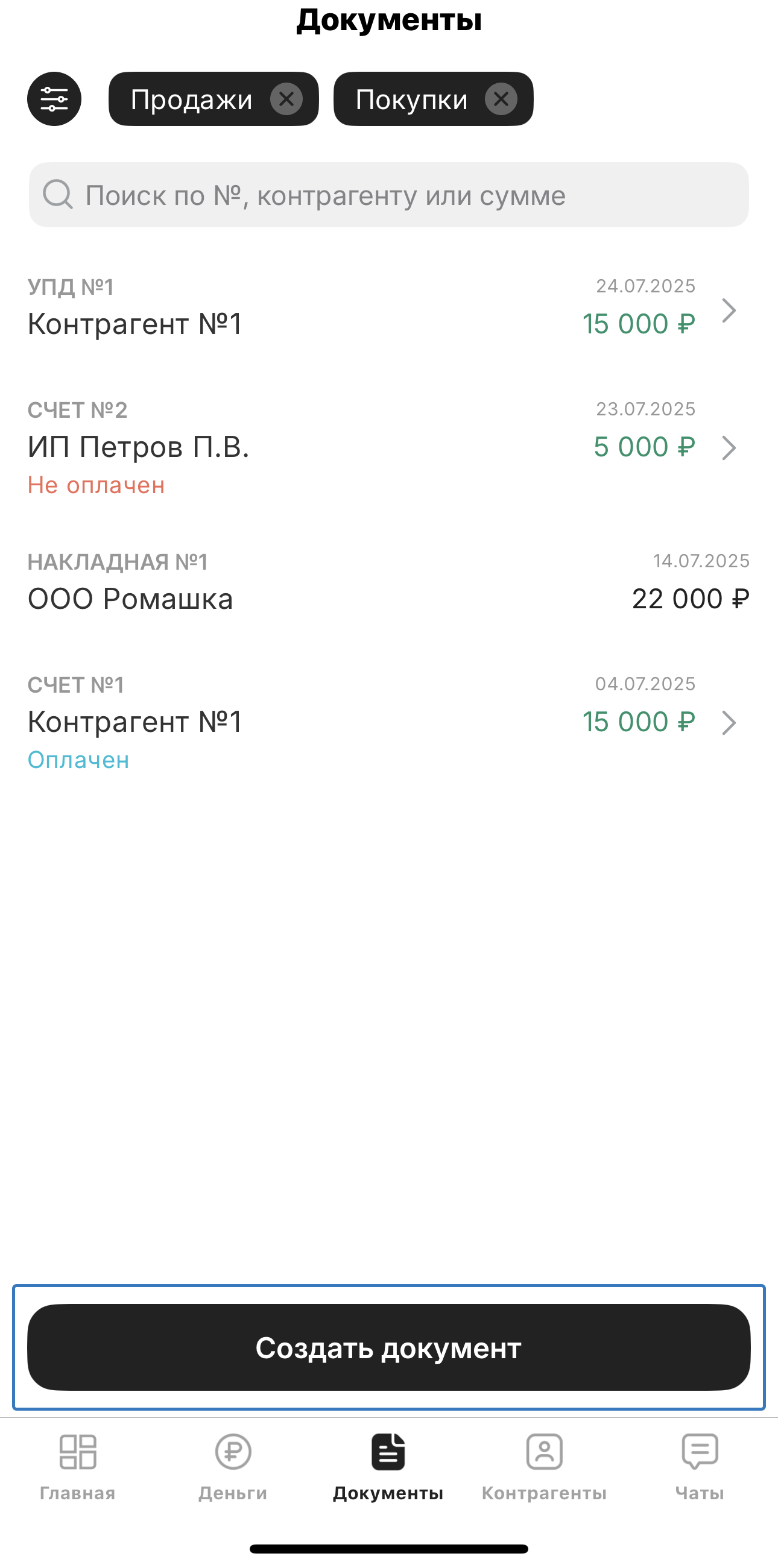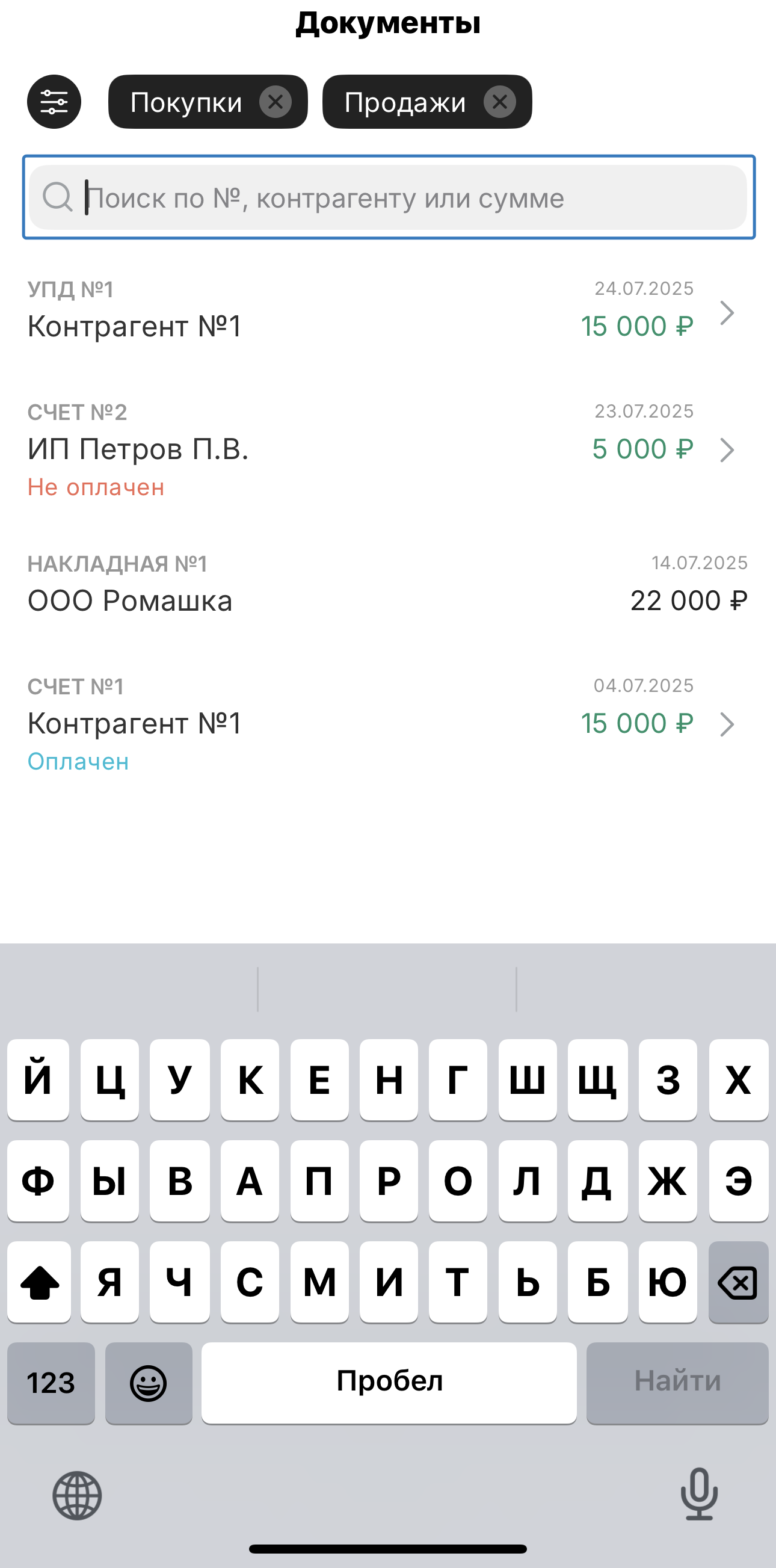 Для поиска документа нажмите на строку «Поиск по №, контрагенту или сумме» или лупу. Поле станет активным, и откроется клавиатура для ввода запроса: