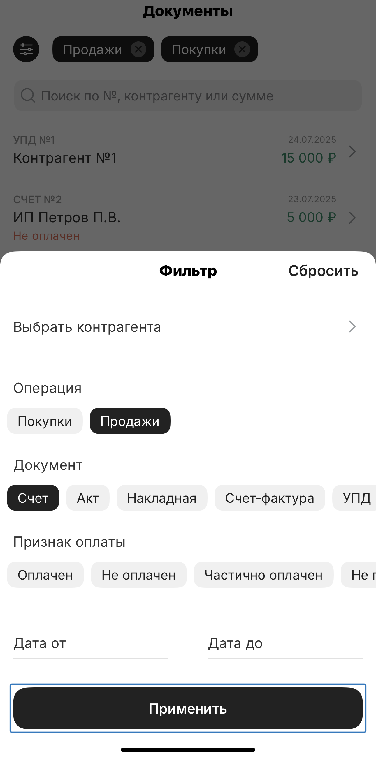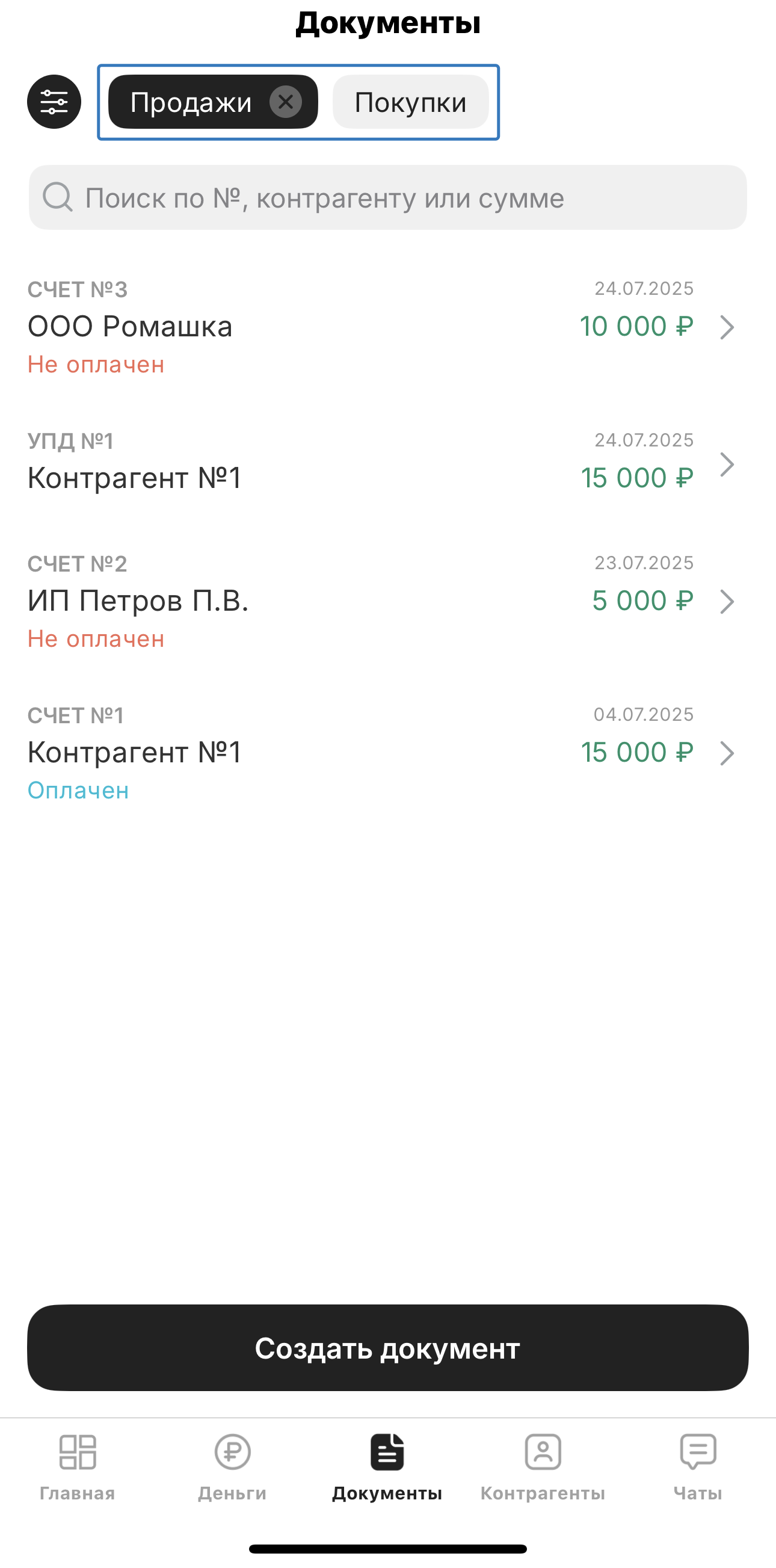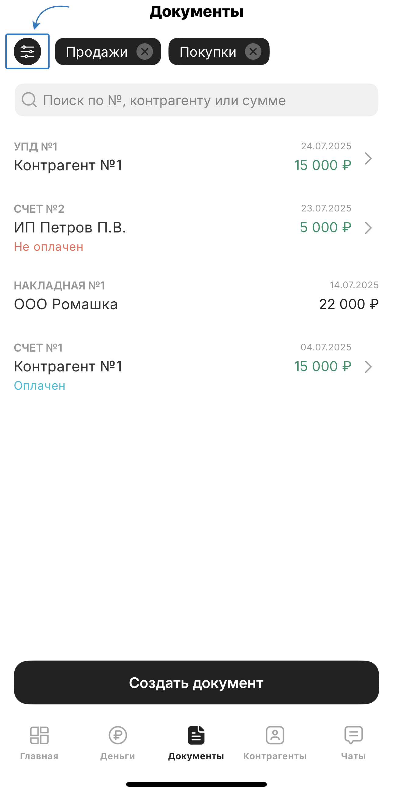 Также вы можете отсортировать документы с помощью кнопок «Покупки» и «Продажи»: