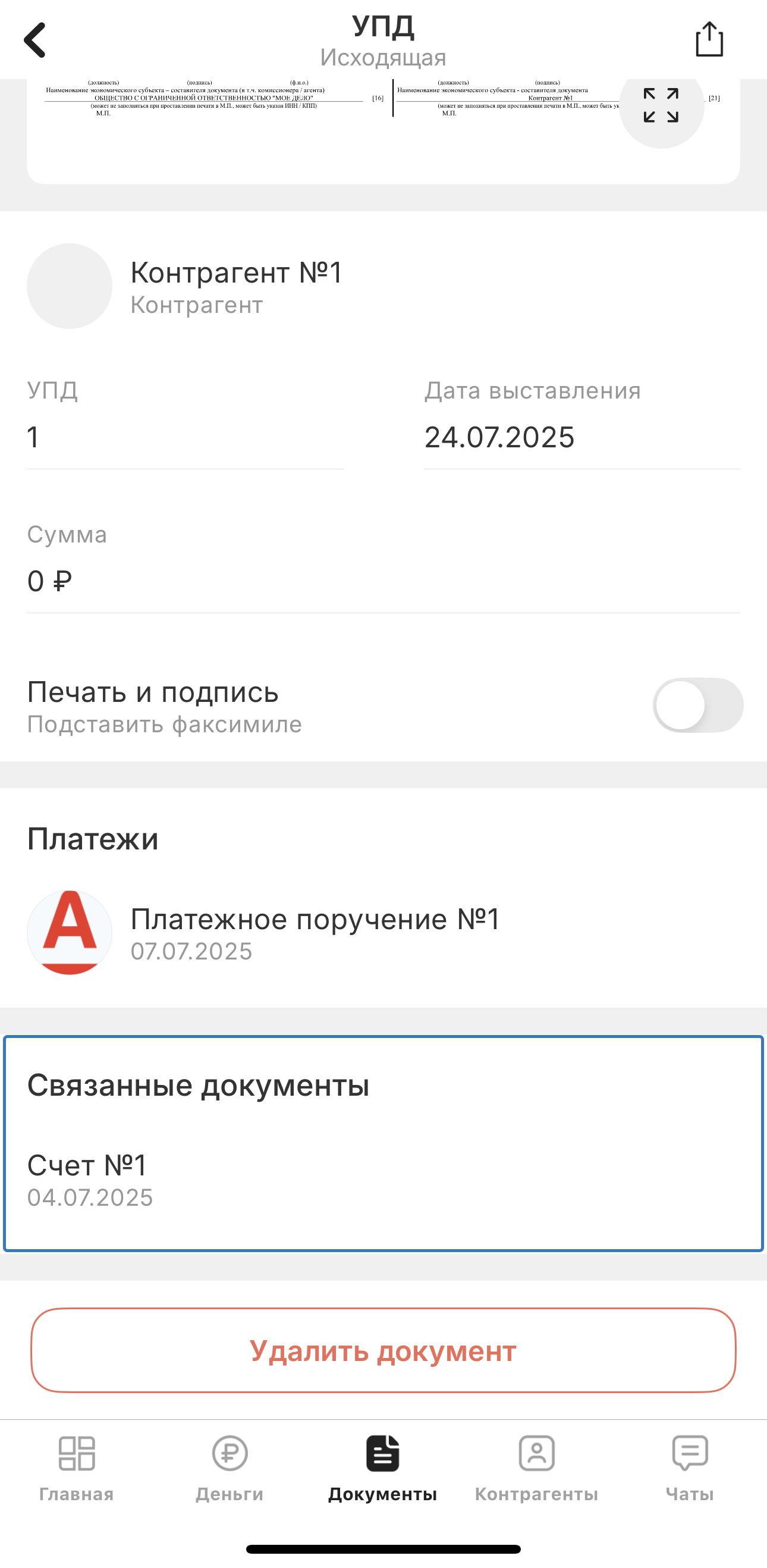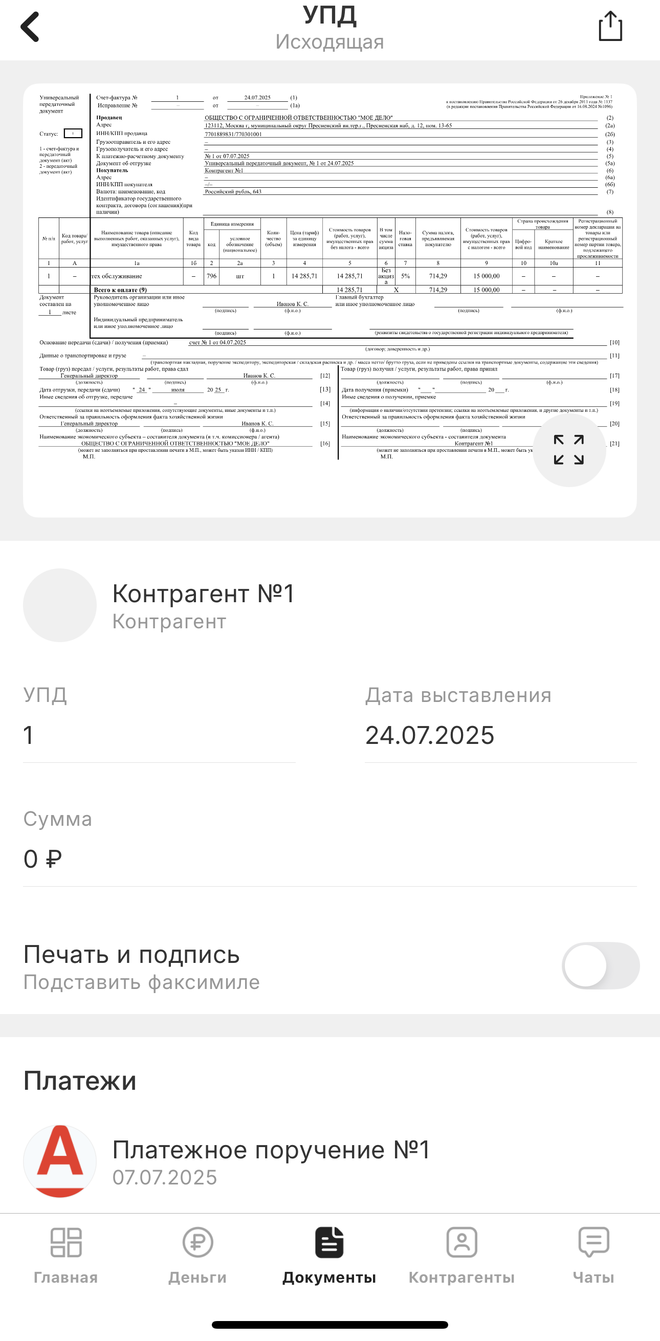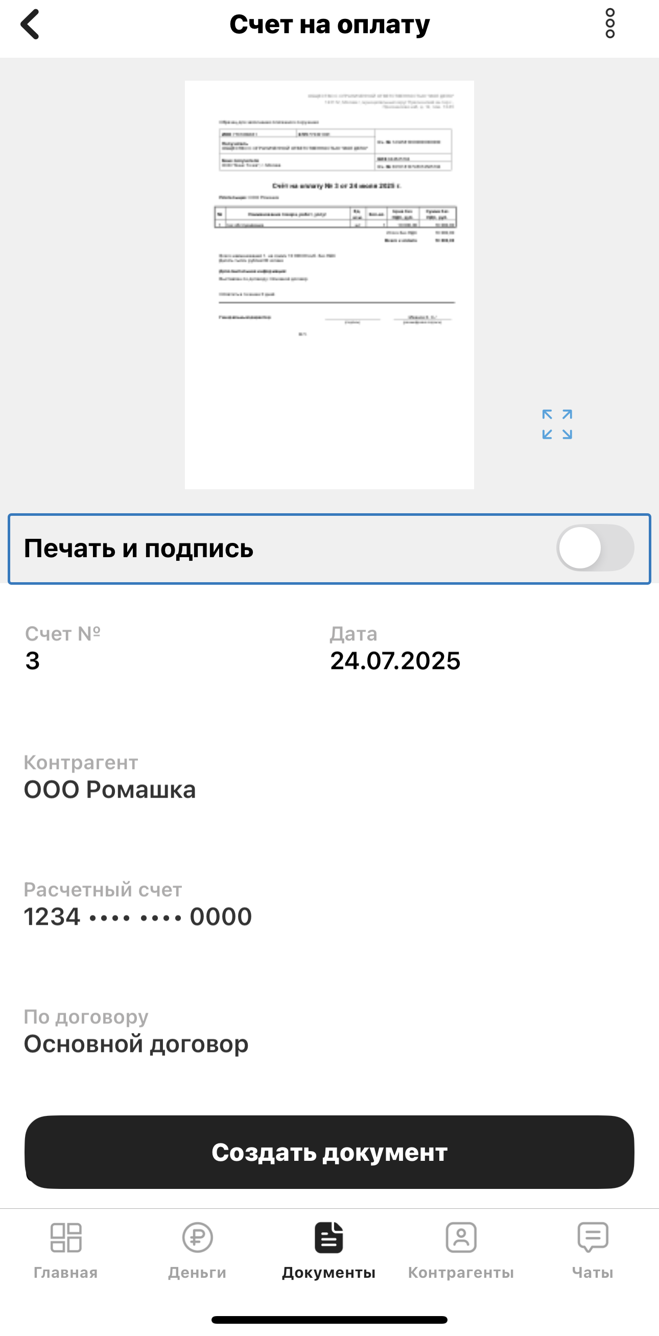 Если ранее в веб-версии вы загрузили печать и подпись, то в документе мобильного приложения будет возможность добавить или убрать печать и подпись.
