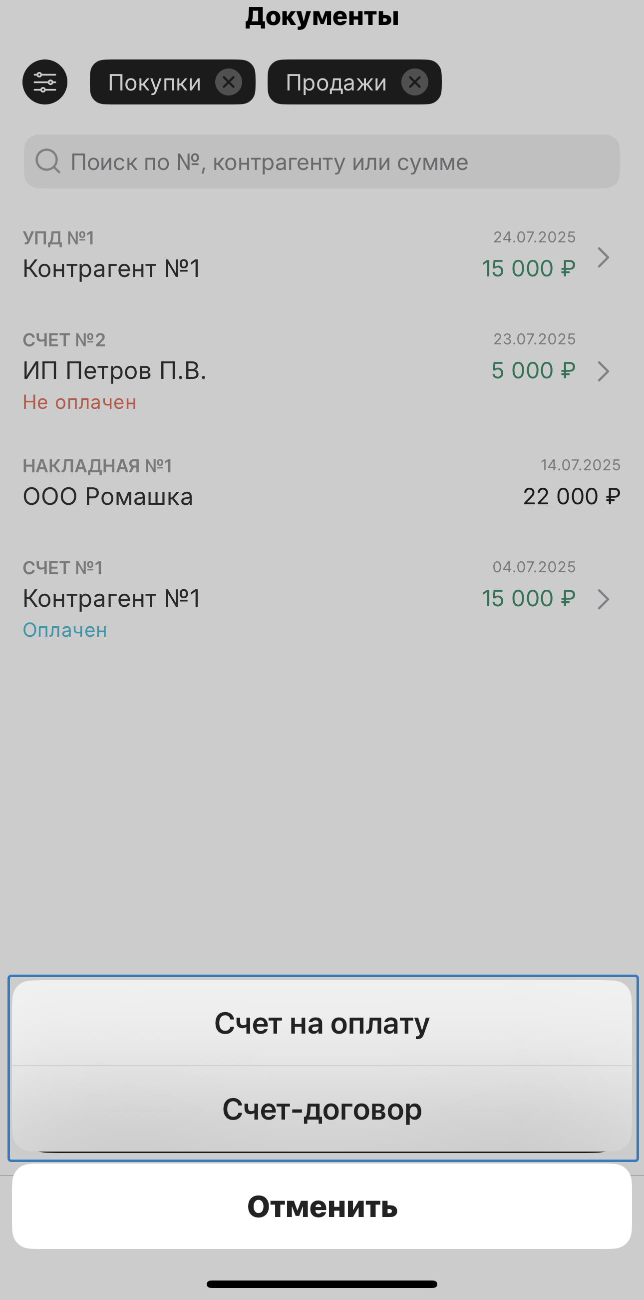 Для создания счёта на оплату или счёта-договора нажмите кнопку «Создать документ» и выберите необходимое:
