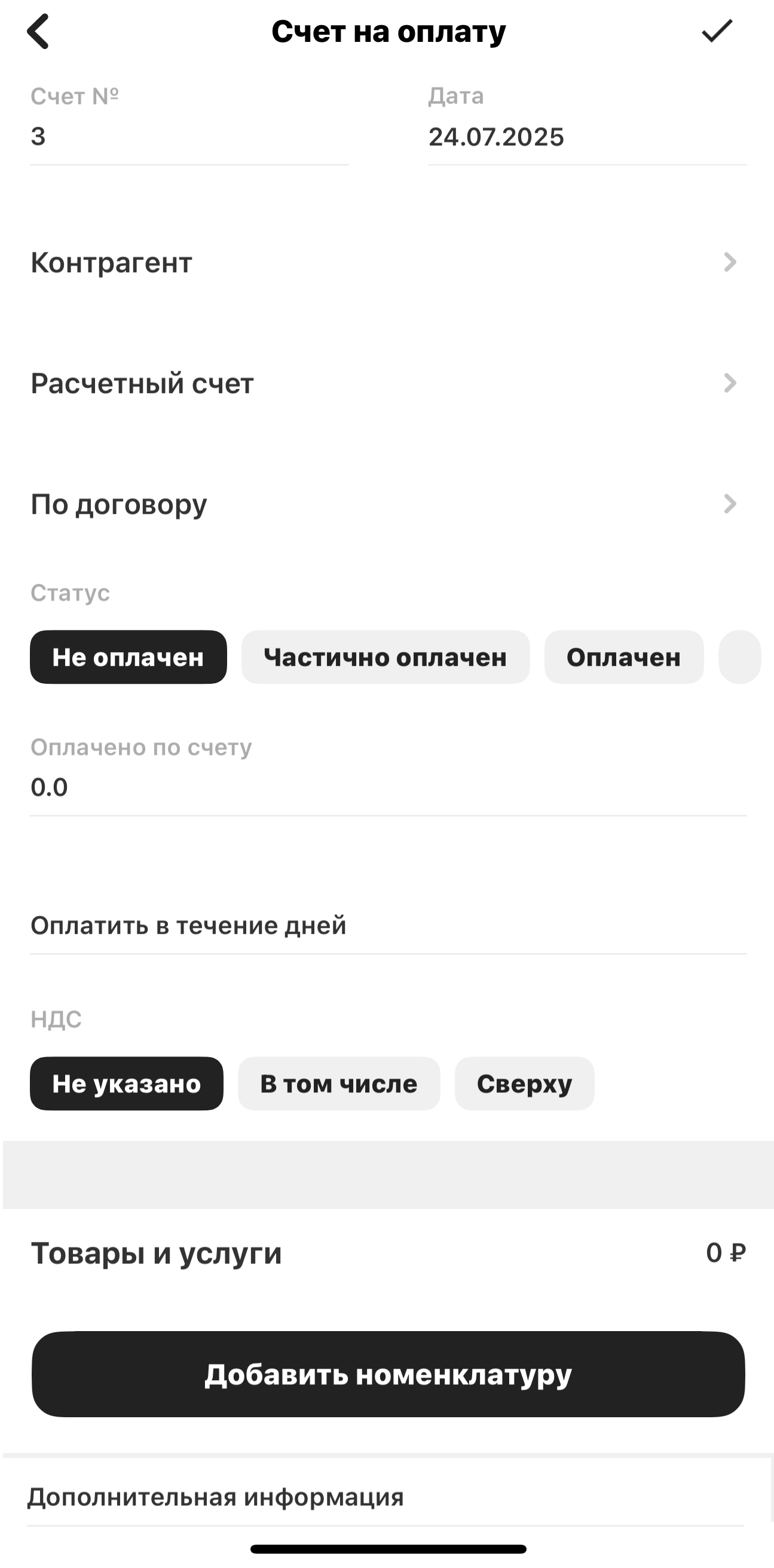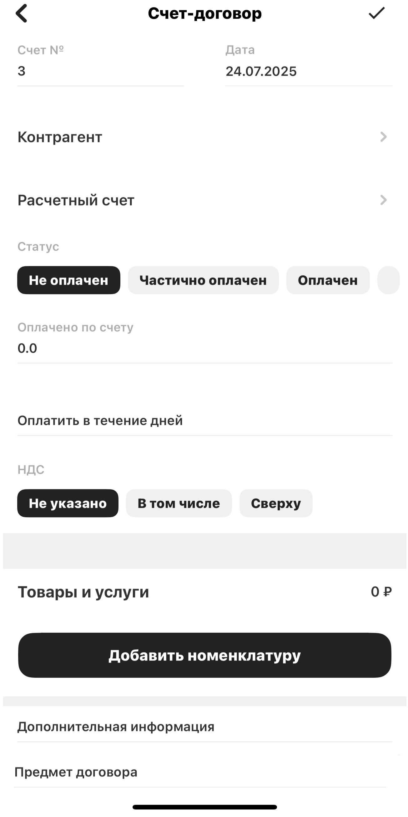 В открывшемся окне внесите данные. Для сохранения документа нажмите на галочку в правом верхнем углу.