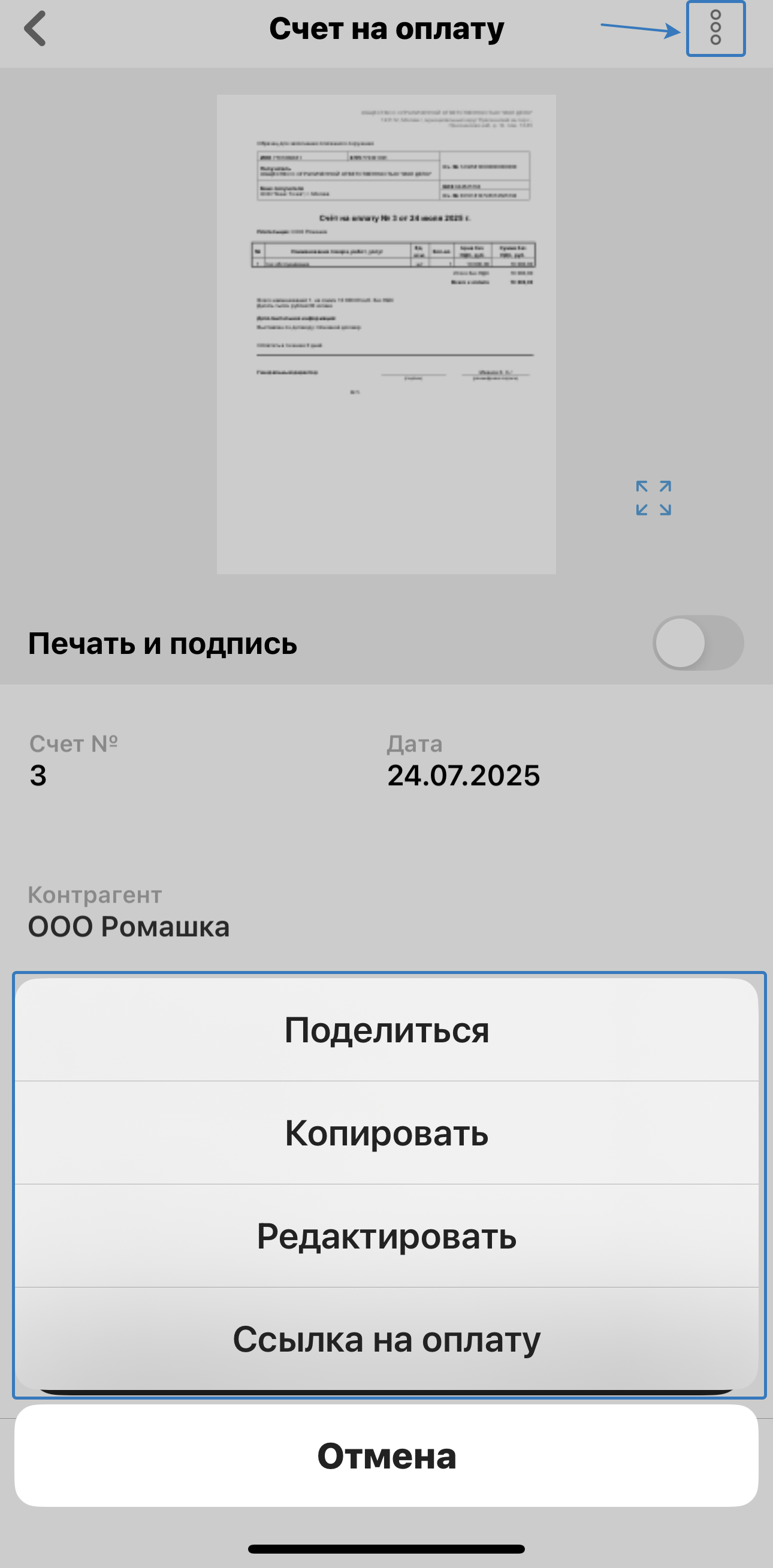 Нажав на три точки справа, есть возможность поделиться, копировать, редактировать, получить ссылку на оплату, а также удалить: