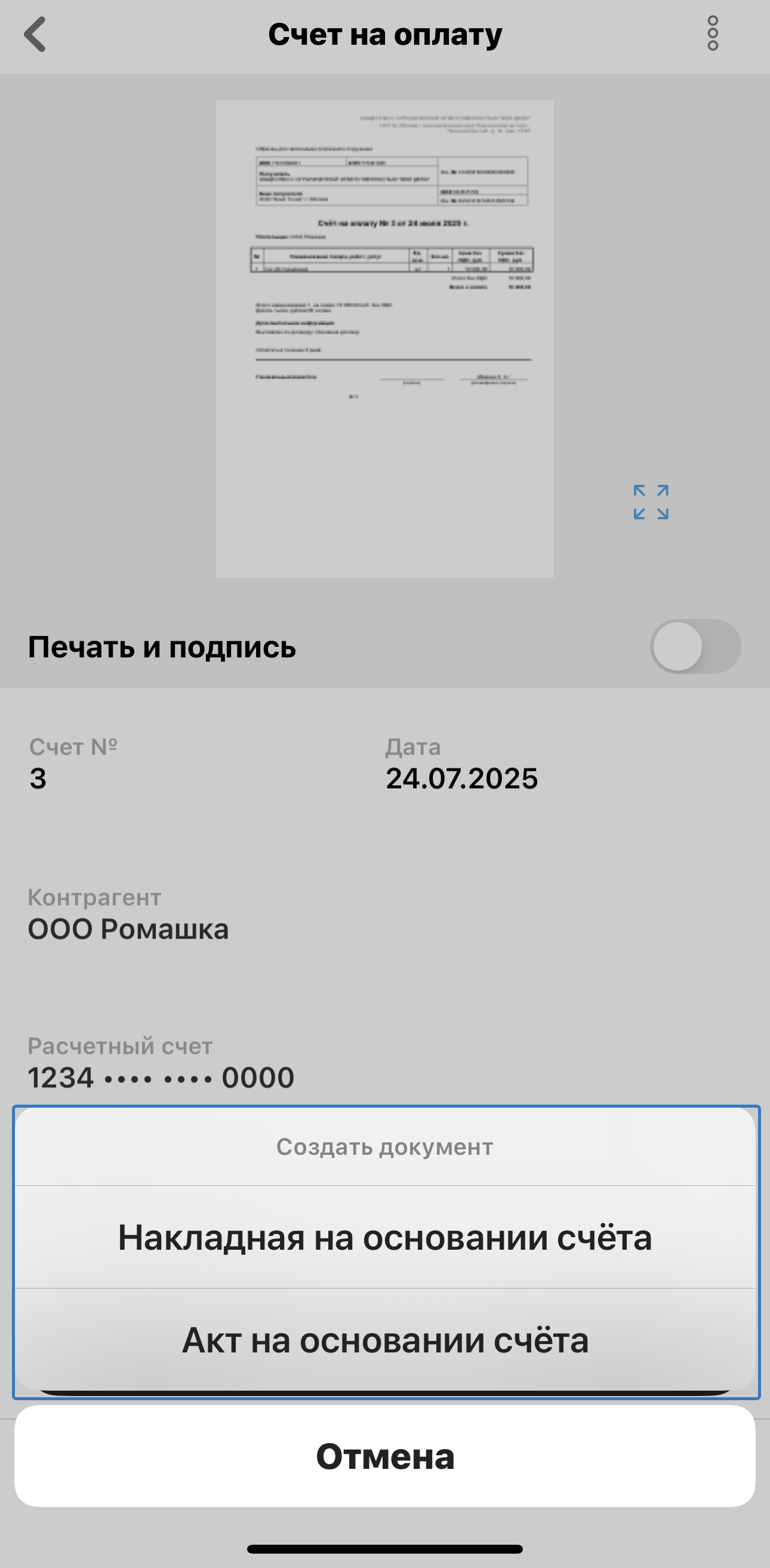 Нажав кнопку «Создать документ», вы можете создавать акты/накладные на основании счёта:
