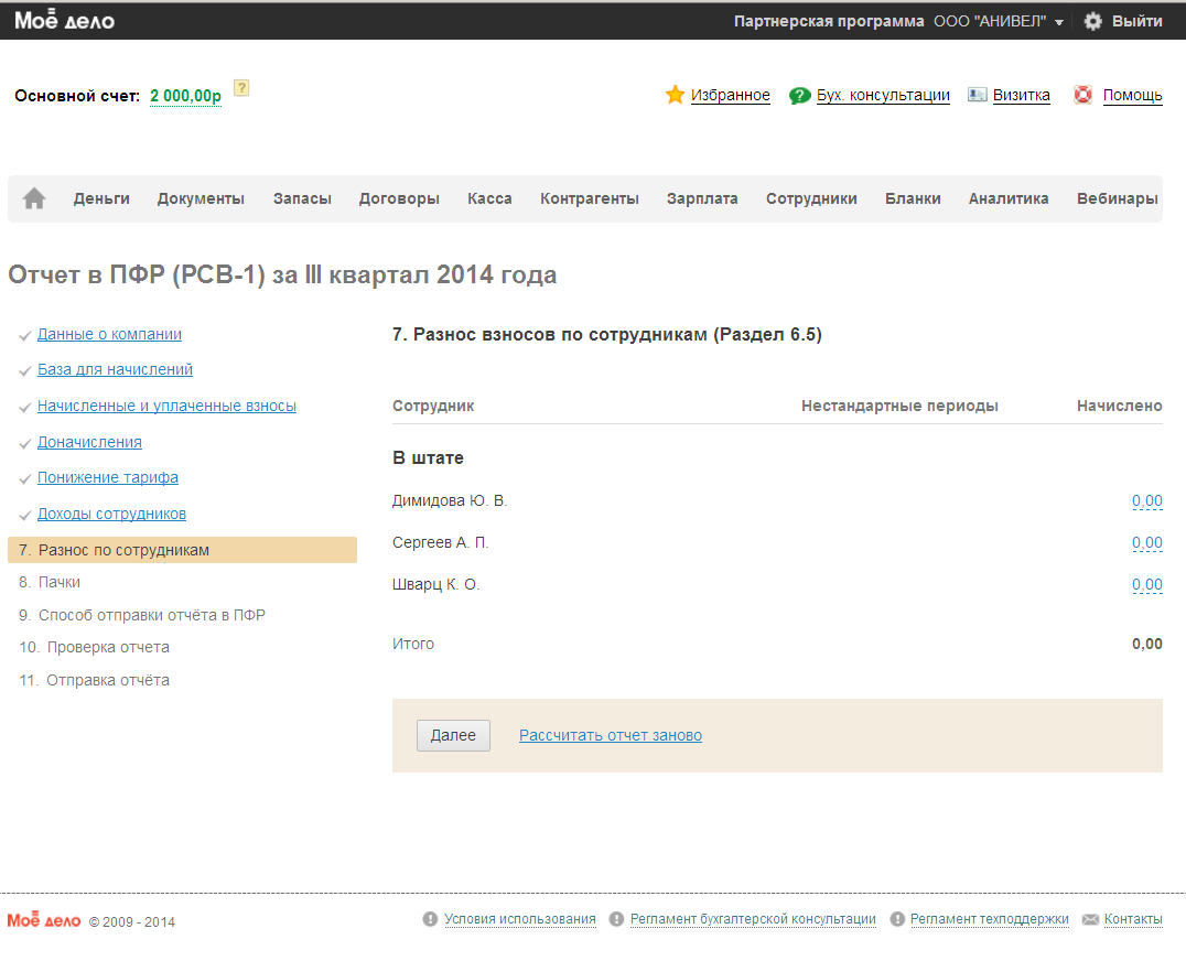 В седьмом шаге мастера указываются начисленные взносы с разбивкой по каждому сотруднику. Кроме этого по колонке "Нестандартные периоды" отражаются обозначения, например, что сотрудник был на больничном ("ВРНЕТРУД"), в отпуске без содержания заработной платы ("АДМИНИСТР") или в декрете ("ДЕКРЕТ"). Обозначение предусмотрено и для работающих по гражданско-правовому договору ("ДОГОВОР" или "НЕОПЛДОГ").