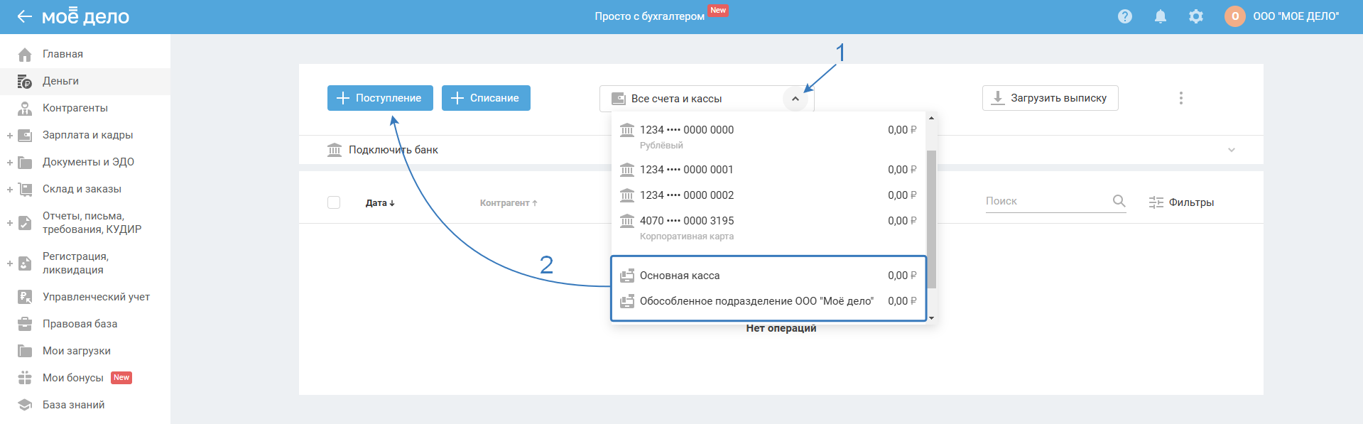 В разделе «Деньги» выберите кассу и нажмите на кнопку «Поступление»: