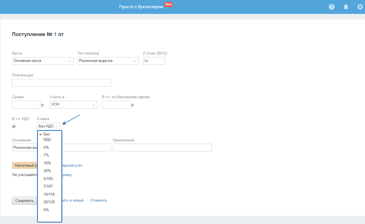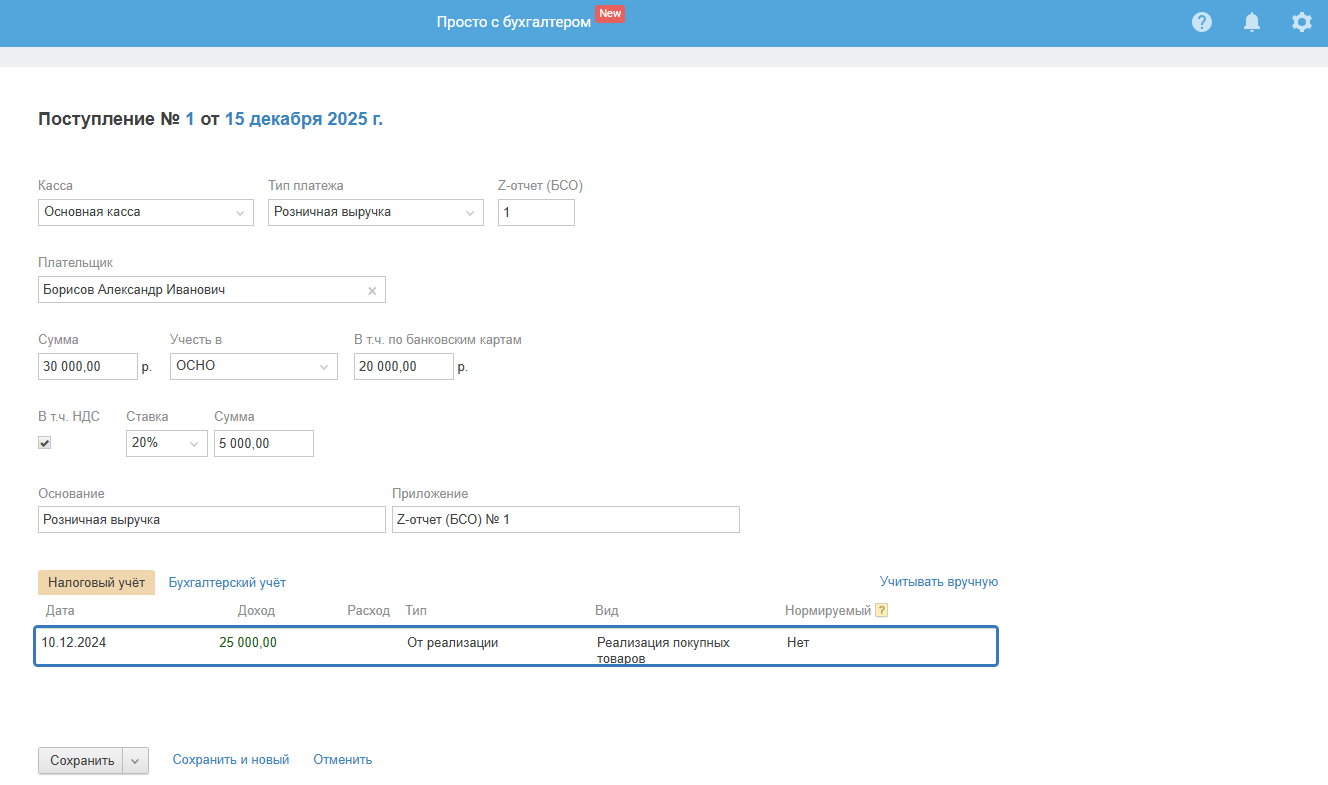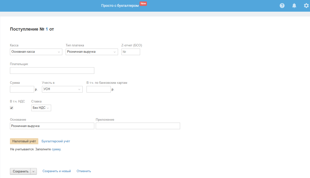 – Учесть в. Данное поле появляется на странице оформления ПКО, если вы совмещаете несколько систем налогообложения (например, УСН и ЕНВД, или ОСНО и ЕНВД). В данном поле необходимо указать систему налогообложения, на которой учитывается тот вид деятельности, за который получены деньги. Например, если выручка получена от магазина на ЕНВД, то в данном поле необходимо выбрать ЕНВД. Если часть денег по одной системе налогообложения, а часть – по другой, то нужно составить отдельные ПКО с типом «Розничная выручка» на каждую из частей. Общая сумма по двум ПКО должна быть равна сумме Z-отчёта (БСО, КМ-6).