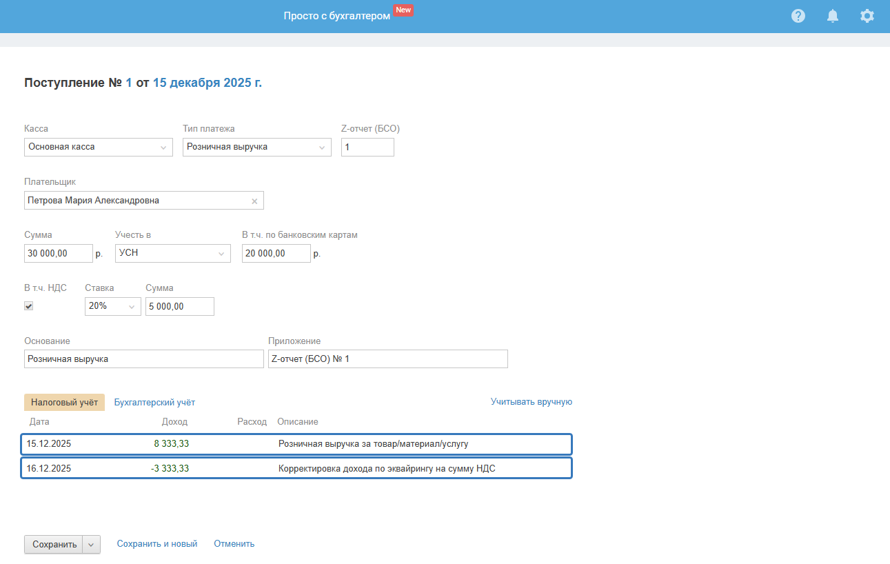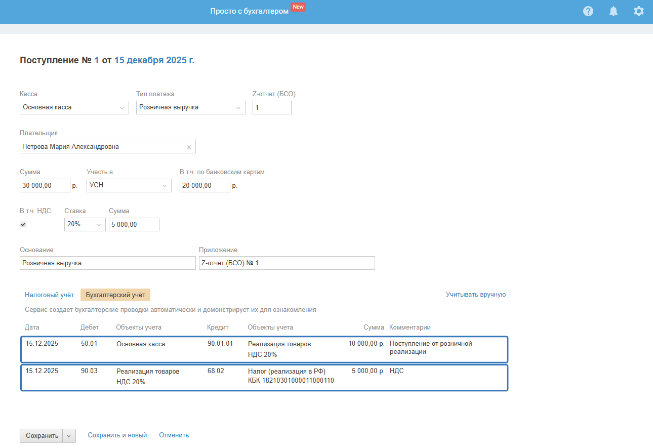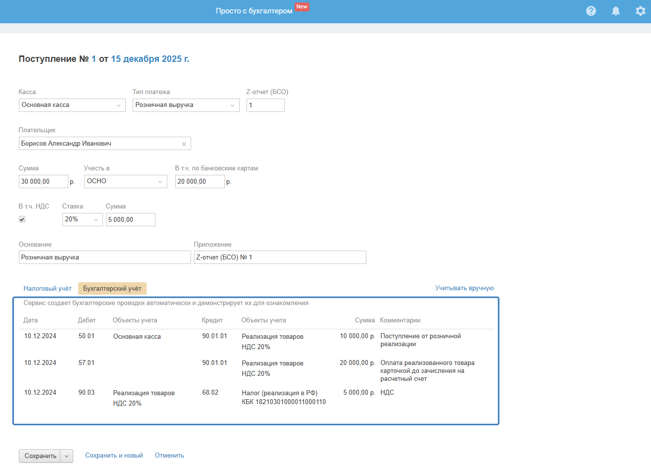 – Учесть в. Данное поле появляется на странице оформления ПКО, если вы совмещаете несколько систем налогообложения (например, УСН и ЕНВД, или ОСНО и ЕНВД). В данном поле необходимо указать систему налогообложения, на которой учитывается тот вид деятельности, за который получены деньги. Например, если выручка получена от магазина на ЕНВД, то в данном поле необходимо выбрать ЕНВД. Если часть денег по одной системе налогообложения, а часть – по другой, то нужно составить отдельные ПКО с типом «Розничная выручка» на каждую из частей. Общая сумма по двум ПКО должна быть равна сумме Z-отчёта (БСО, КМ-6).