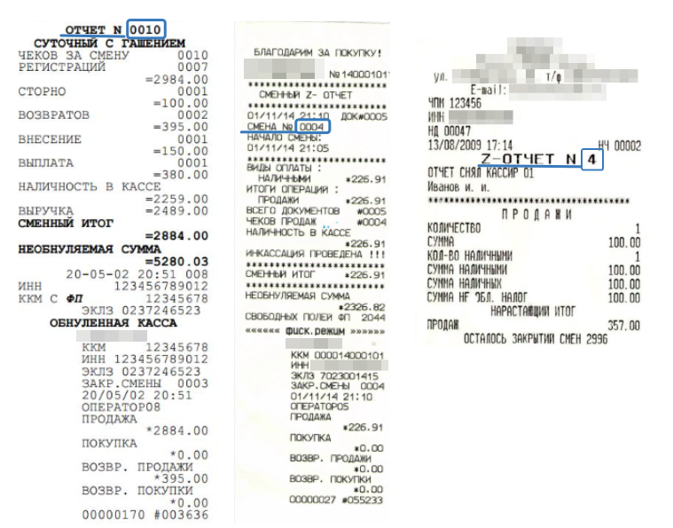 Z-отчёт (отчёт о закрытии смены, номер чека за смену) — это итоговый отчёт онлайн-кассы, который формируется при закрытии смены и содержит информацию о всех кассовых операциях, выполненных за рабочий день. Номер чека за смену (Z-отчёт) чаще всего находится под адресом торговой точки, рядом с датой расчёта и ФИО кассира. Данный отчёт не является унифицированным, поэтому в зависимости от вашей онлайн кассы отчёт может иметь разный вид, а номер Z-отчёта находиться в любом месте чека. Если вы не можете найти номер Z-отчёта, то рекомендуем вам обратиться в техническую поддержку онлайн-кассы.