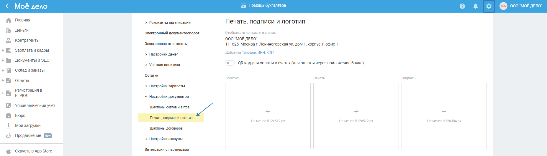 Для того чтобы перейти в раздел «Печать, подписи и логотип»: