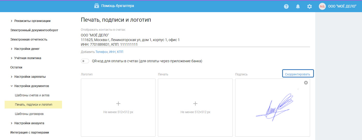 После того, как вы загрузите подпись, в сервисе появится возможность скорректировать её расположение для документов: акта, накладной, счёта и УПД.