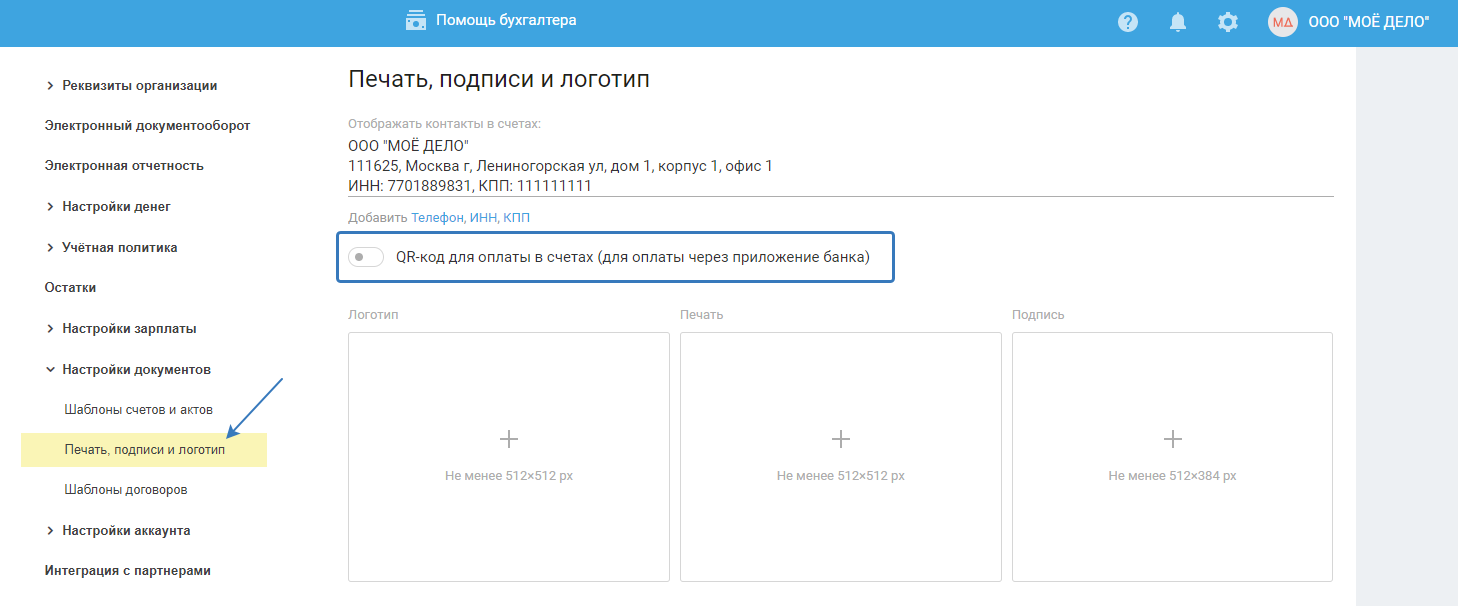 Для того, чтобы добавить QR-код в счета и счета-договоры, включите тумблер «QR-код для оплаты в счетах» в разделе «Реквизиты» — «Настройки документов» — «Печать подписи и логотип»:
