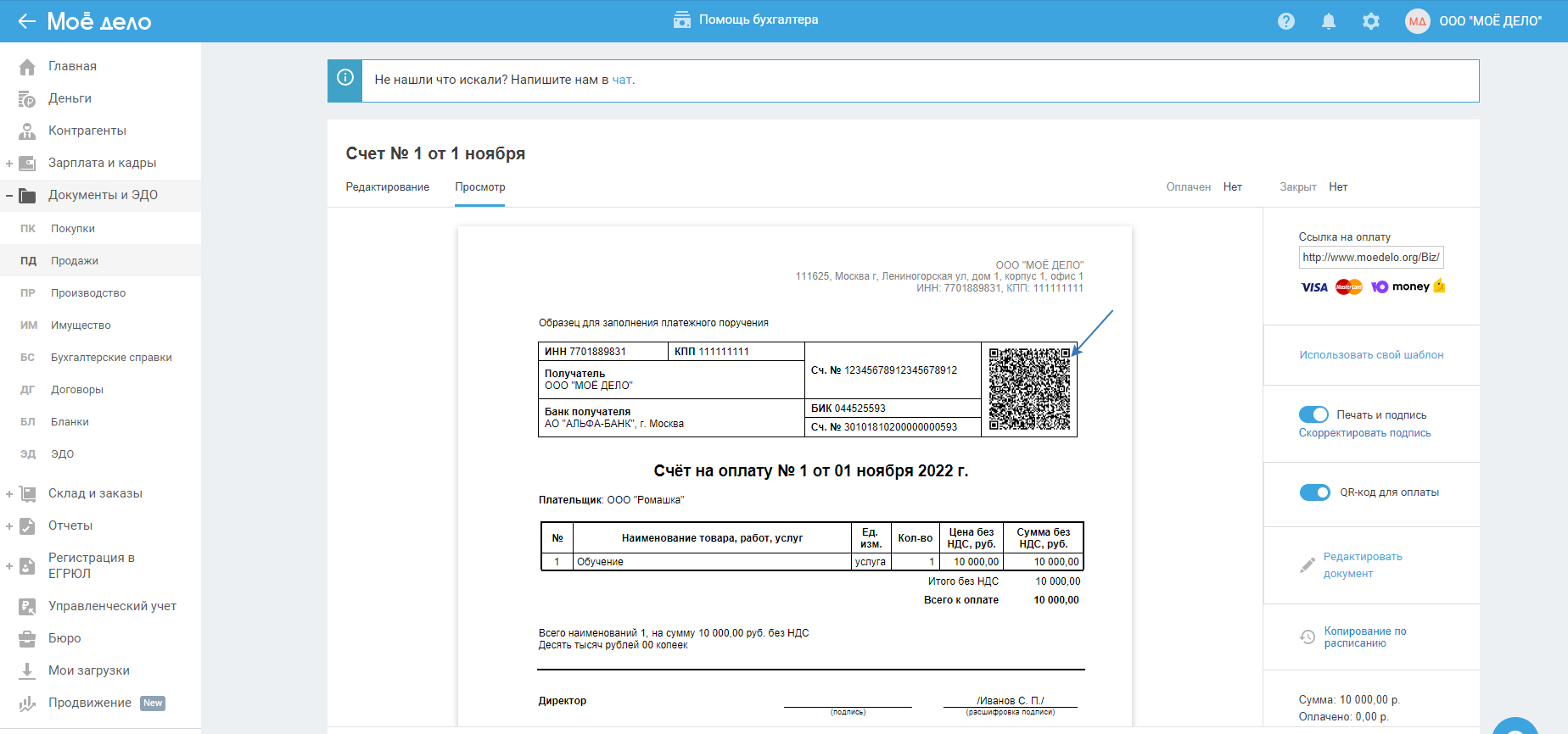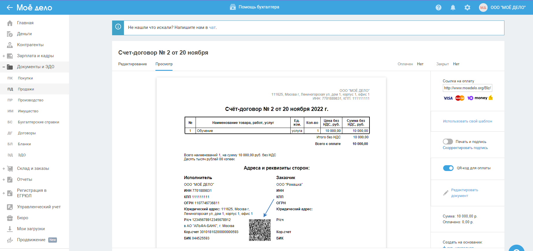 После этого QR-код будет добавлен в печатную форму счёта и счёта-договора:
