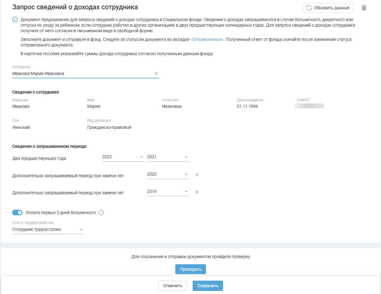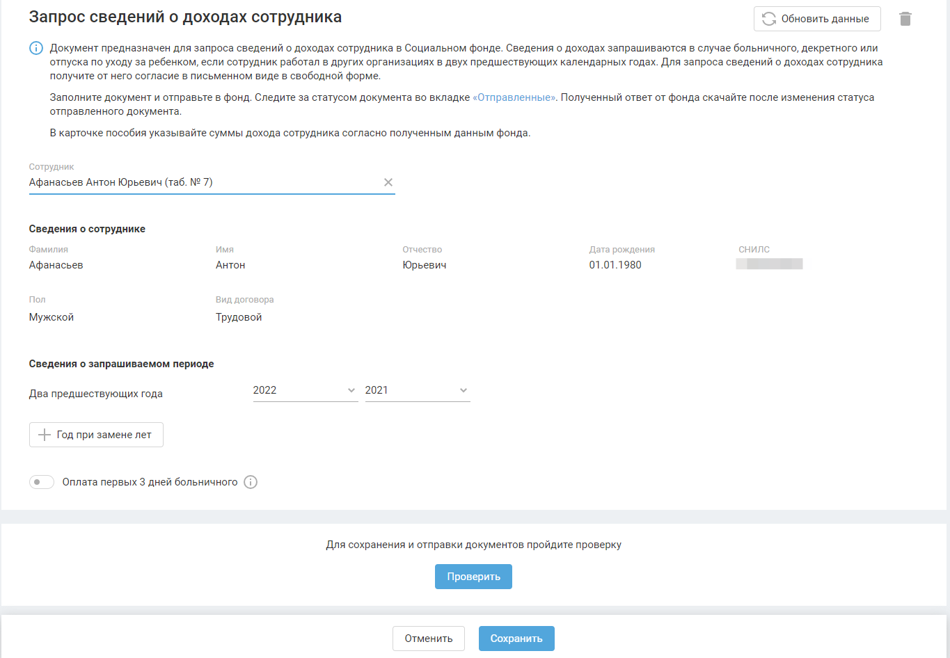 В случае изменения данных в карточке больничного или реквизитах сотрудника обновите данные в документы с помощью кнопки «Обновить данные».
