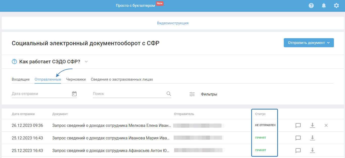 Отслеживайте изменения статуса документа во вкладке «Отправленные». При статусе «Отклонён» здесь отображается информация об ошибке. Чтобы исправить сведения о застрахованном лице, во вкладке сотрудника измените данные, сформируйте сведения заново и отправьте.