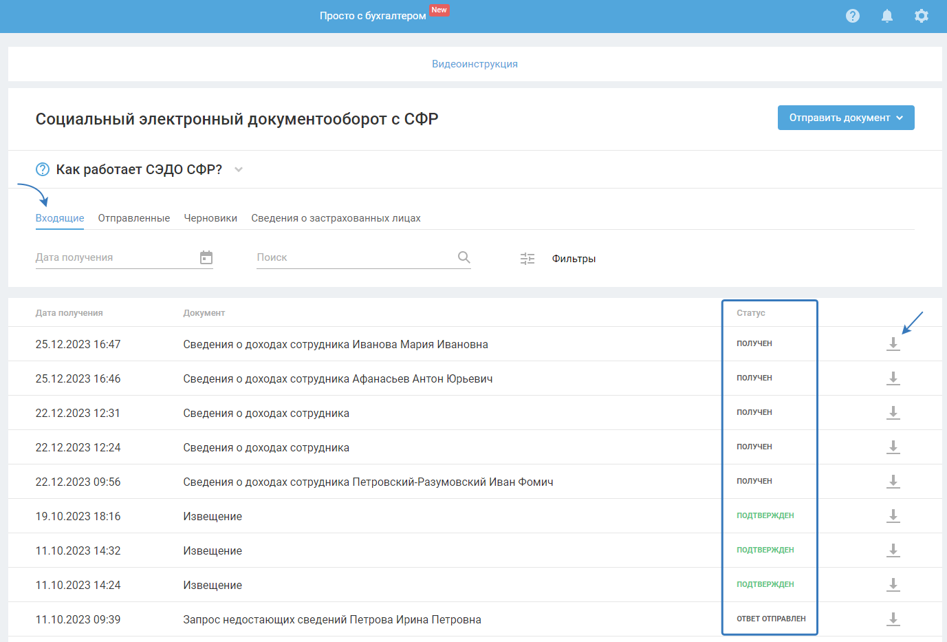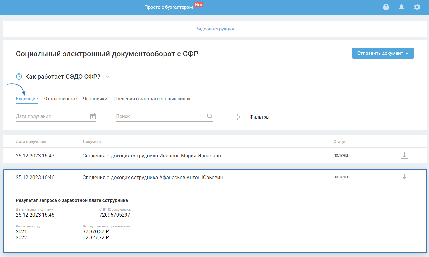 8. После получения документа СФР отправит сведения о доходах. Вы можете увидеть входящий документ «Сведения о доходах сотрудника» в разделе «СЭДО СФР — Входящие». Чтобы скачать архив документа из СФР, нажмите на значок скачивания.