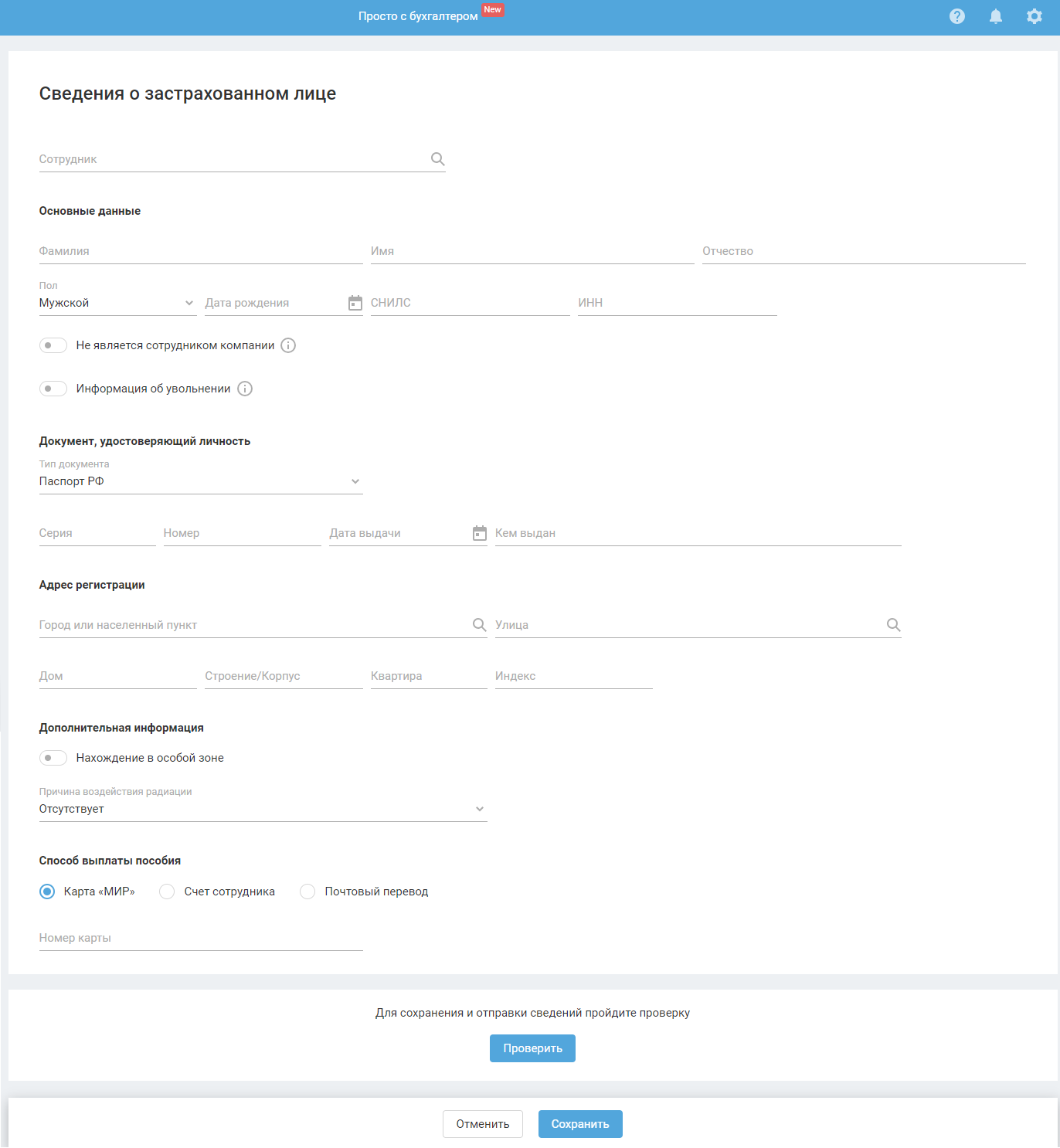 - Способ выплаты пособия — данные берутся из последнего сохранённого реестра по сотруднику в разделе «Реестры СФР». Если его нет — из реквизитов сотрудника.