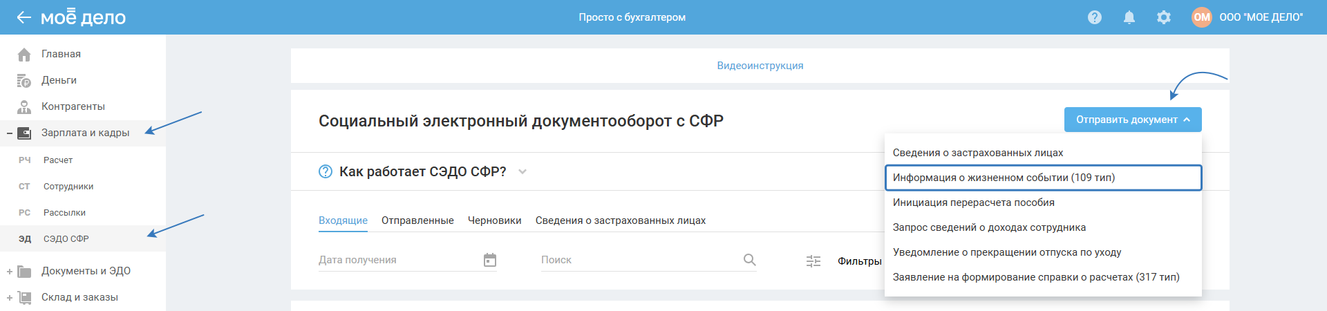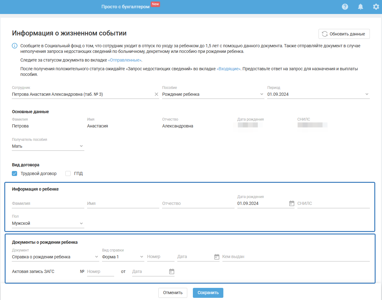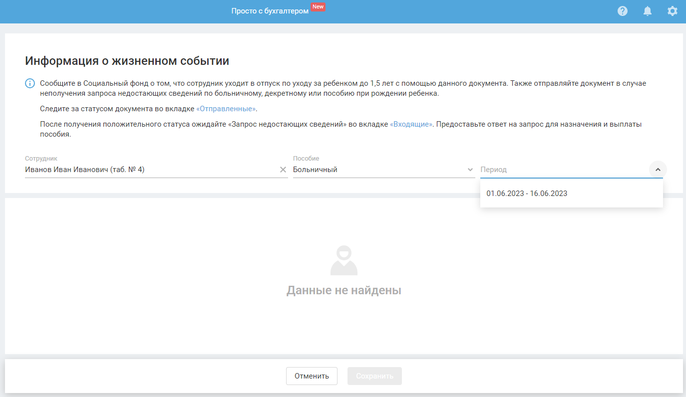 Если пособие еще не выплачено сотруднику, нажмите «Отправить документ», выберите «Информация о жизненном событии (109 тип)». Заполните необходимые поля и отправьте. После отправки данного документа поступит новый «Запрос недостающих сведений», на который требуется предоставить ответ в разделе «Входящие».