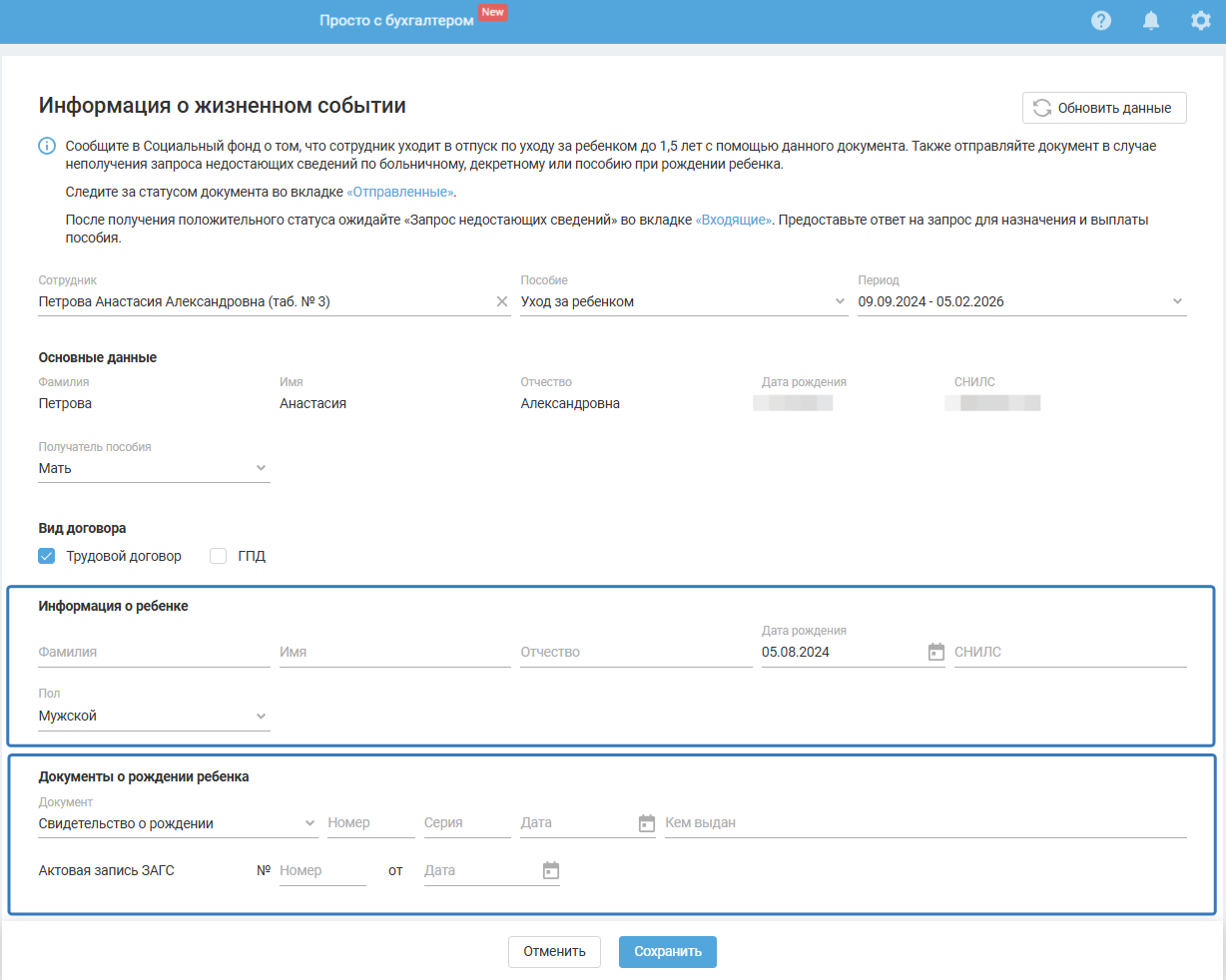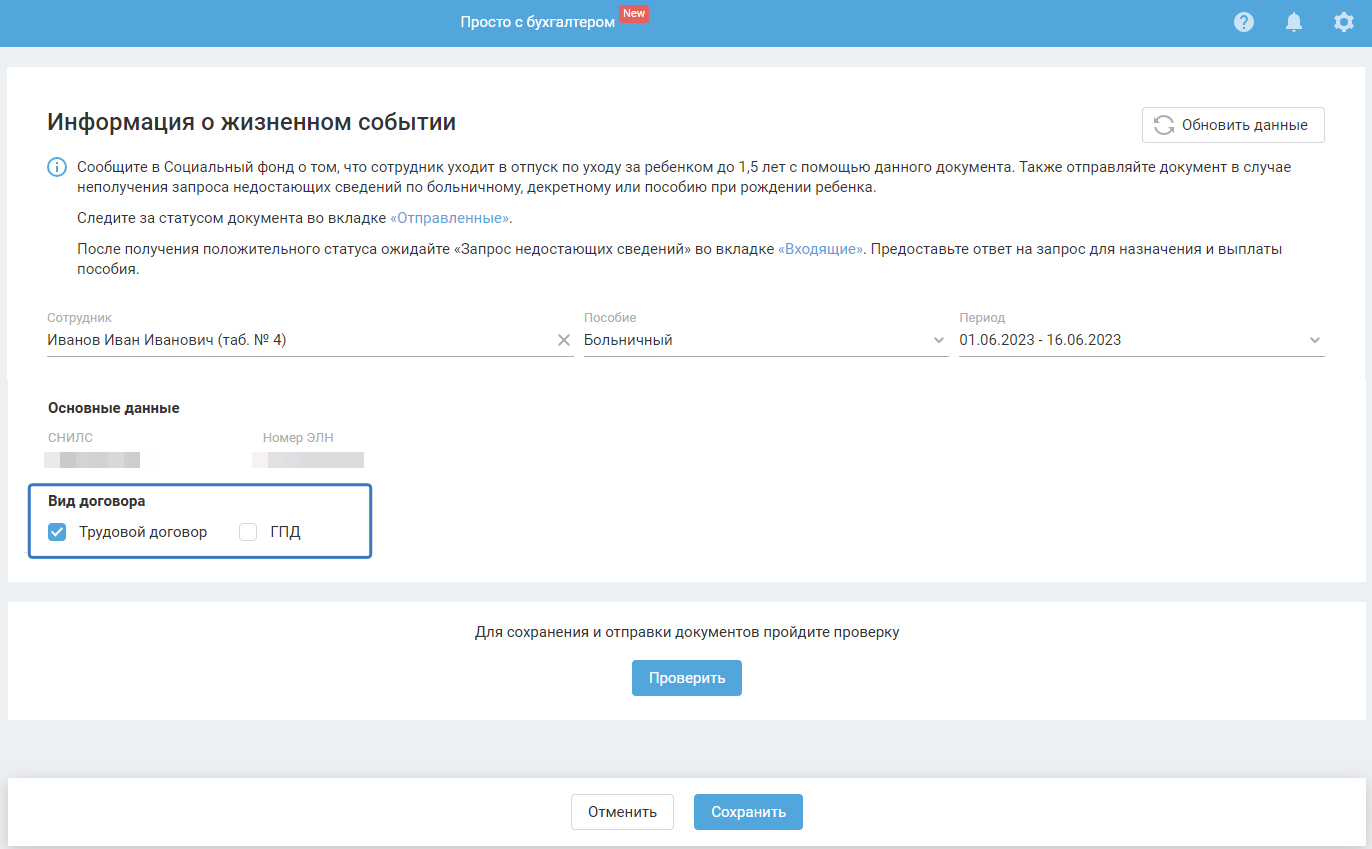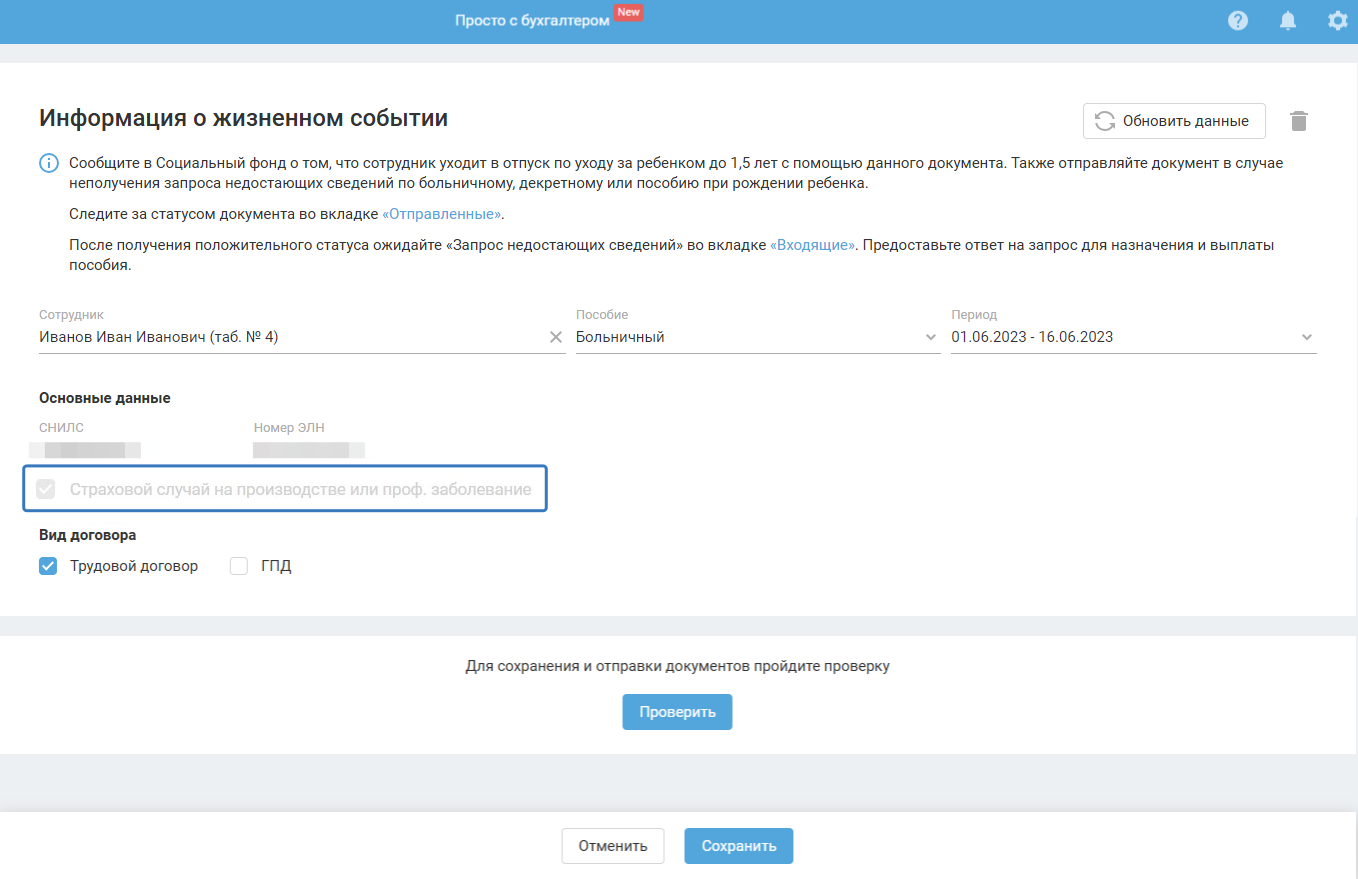 При выборе больничного/декретного будут автоматически заполнены данные СНИЛС и номер ЭЛН.