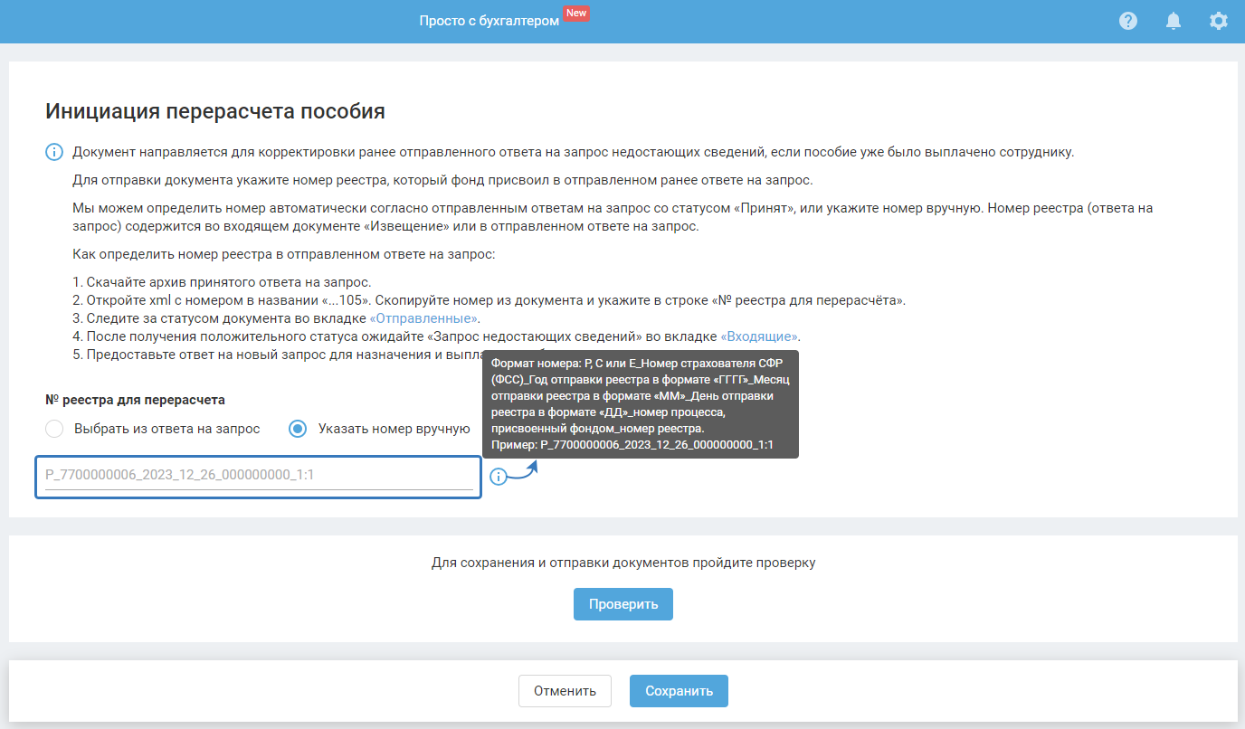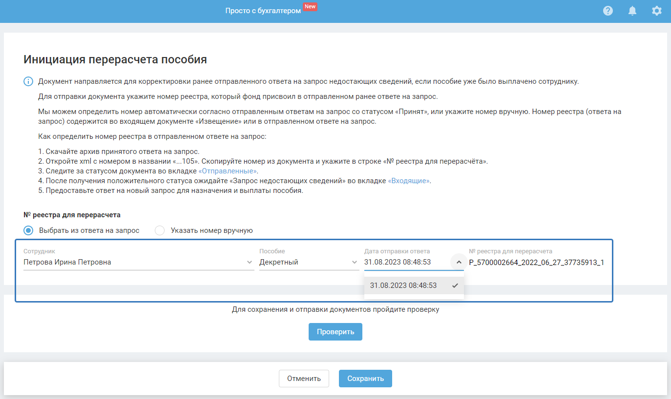 Обязательно поставьте галочку в поле «Перерасчёт пособия» (чтобы в xml-файле ответа на запрос отразился атрибут о перерасчёте для фонда) и отправьте в СФР.