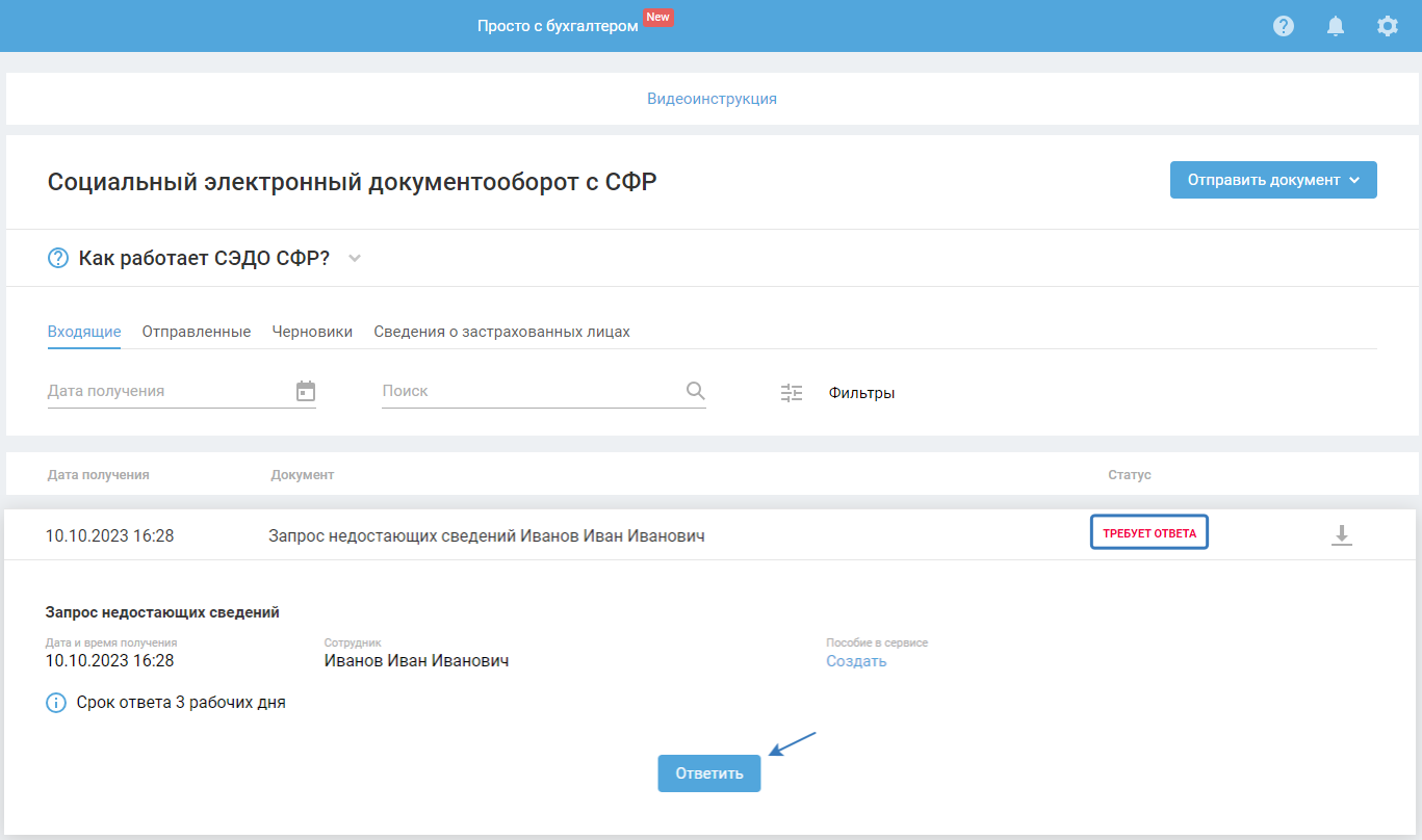 Зайдите в раздел «СЭДО СФР – Входящие», откройте первичный входящий запрос недостающих сведений и нажмите на кнопку «Ответить повторно».