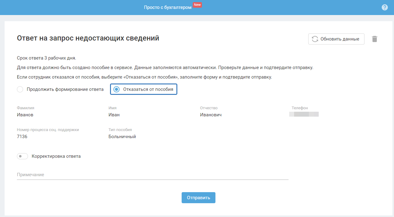 Нажмите «Ответить», выберите «Отказаться от пособия». В примечании укажите «Фамилия сотрудника не совпадает. Текущая фамилия <укажите актуальную фамилию сотрудника>». Перейдите во вкладку «Сведения о застрахованных лицах» и отправьте повторно сведения о сотруднике в фонд, если вы не отправляли их после смены фамилии сотрудника.
