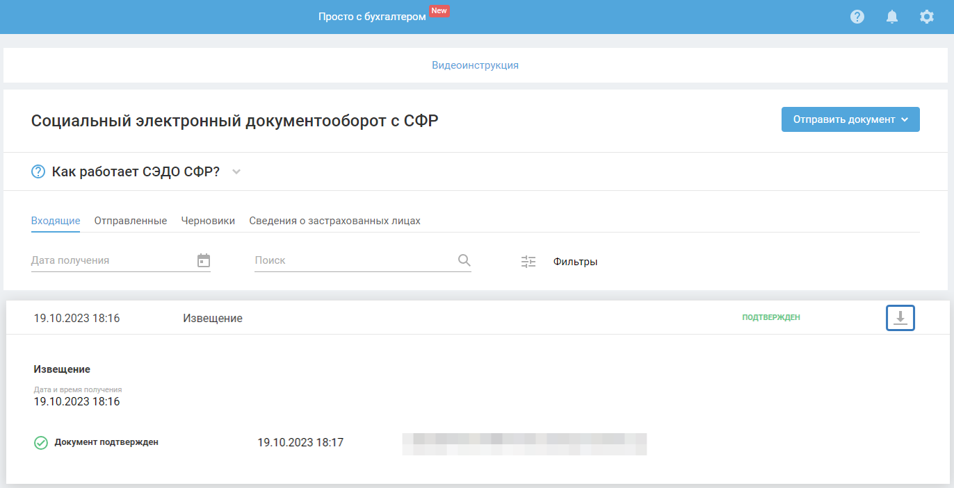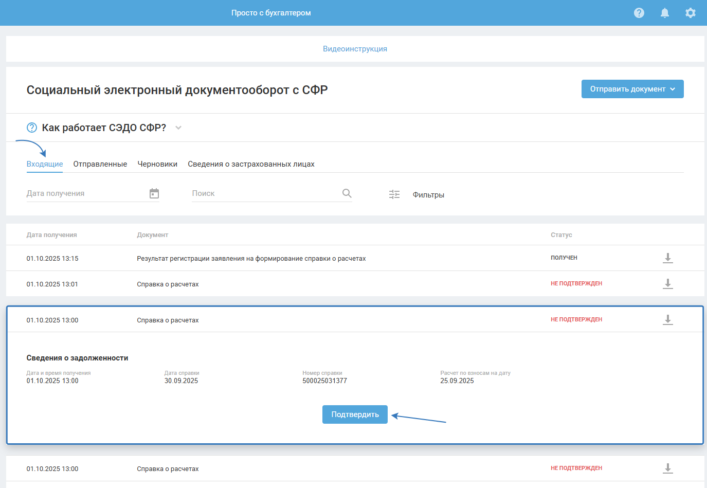 Далее нажмите «Подтвердить», чтобы отправить в СФР информацию о её получении.
