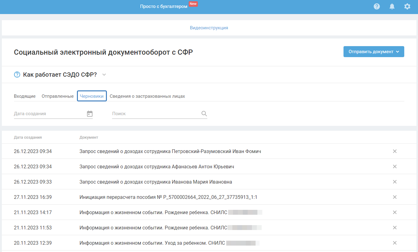 Для создания формы нажмите на кнопку «Отправить документ» и выберите из выпадающего списка «Сведения о застрахованных лицах»: