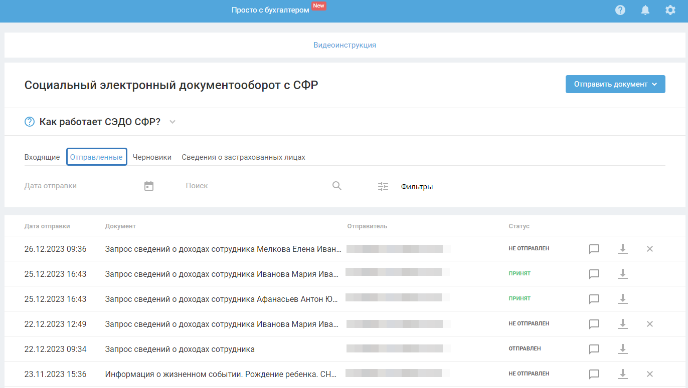 В разделе «СЭДО СФР — Отправленные» отображаются все отправленные документы. Здесь можно отслеживать статусы отправленных документов.