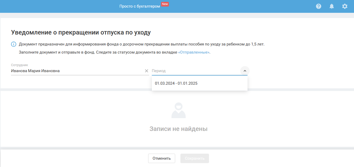 Для создания документа нажмите на кнопку «Отправить документ» и выберите из выпадающего списка «Уведомление о прекращении отпуска по уходу»:
