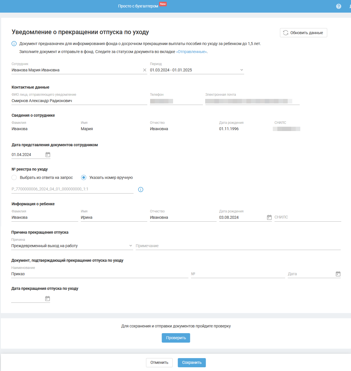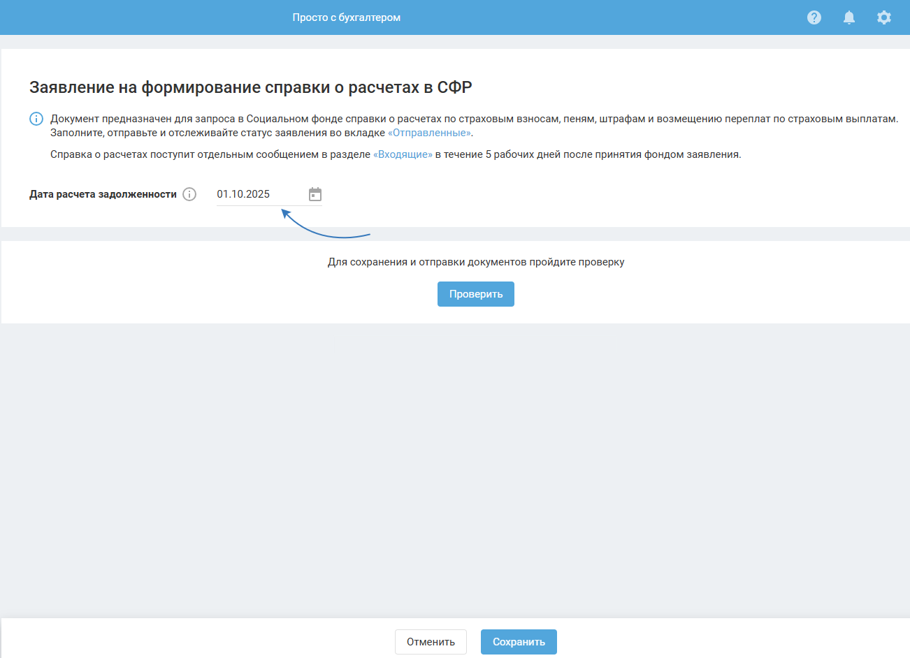 Для сохранения и отправки документов нажмите «Проверить».