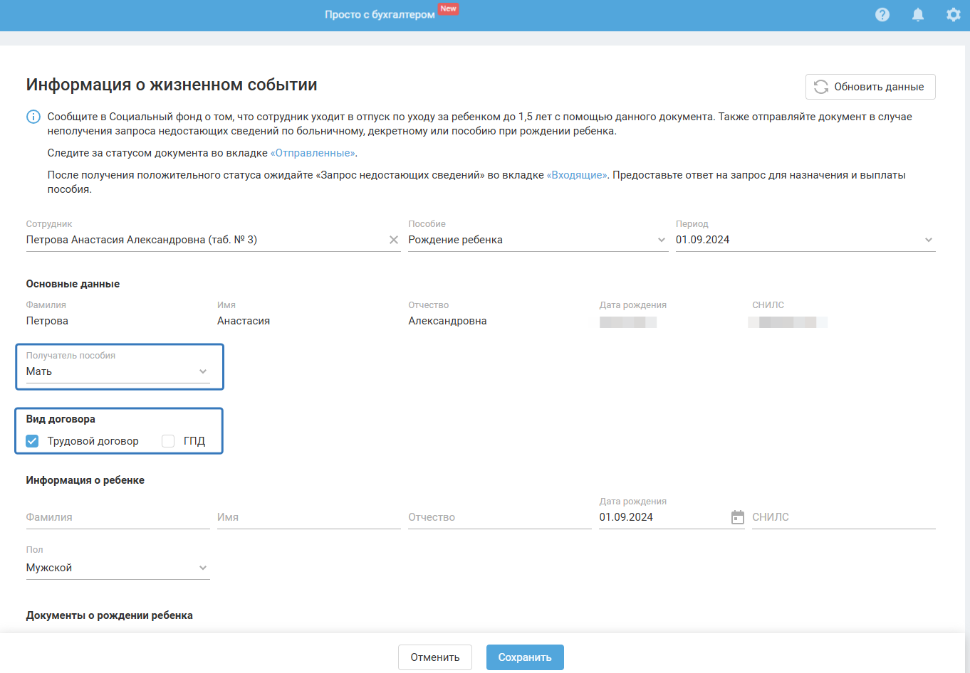 При выборе пособия по уходу за ребёнком будут автоматически заполнены данные: ФИО, дата рождения и СНИЛС.