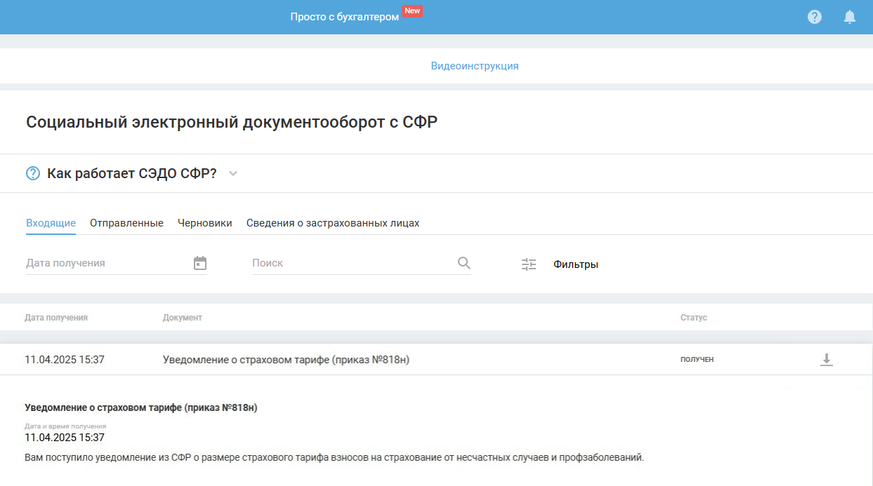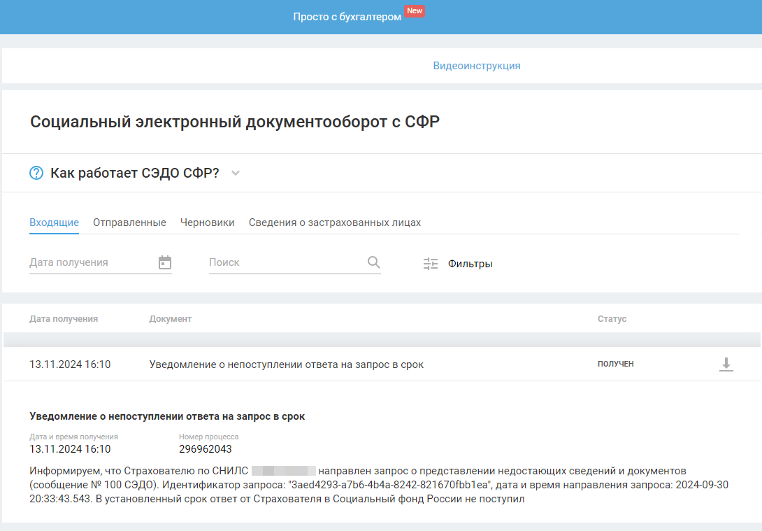 В ответ СФР пришлёт уведомление о регистрации заявления (статус изменится на «Принят») и справку о состоянии задолженности. Справка отобразится в разделе «СЭДО СФР — Входящие».