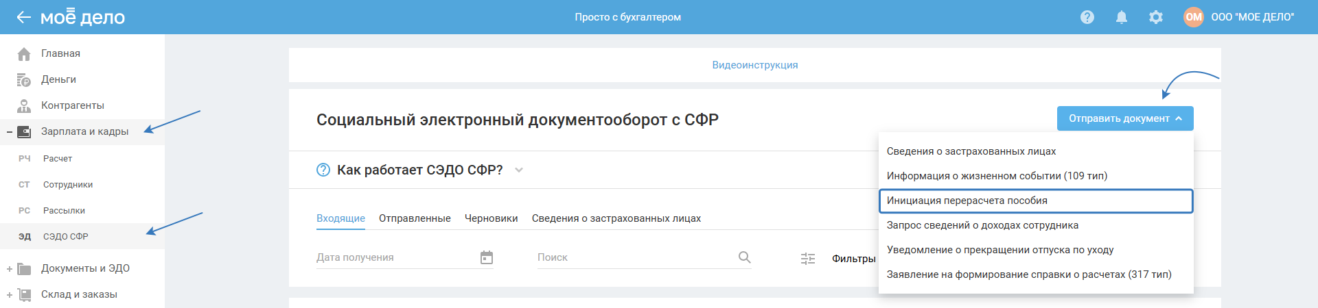 В разделе «СЭДО СФР – Отправленные» нажмите «Отправить документ» и выберите «Инициация перерасчёта пособия».