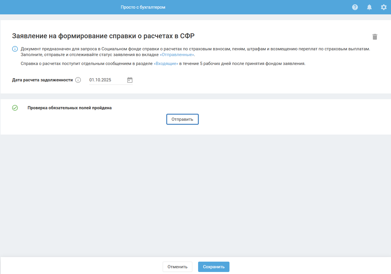 Далее нажмите «Проверить» и отправьте документ в фонд.