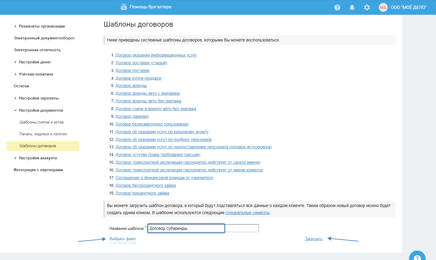 В разделе «Шаблоны договоров» нажмите кнопку «Выбрать файл». Выберите сохраненный шаблон договора. Назовите загружаемый шаблон для того, чтобы в дальнейшем идентифицировать его в выпадающем списке шаблонов договоров. Например «Мой шаблон» (на содержание договора это не повлияет). Загрузите.