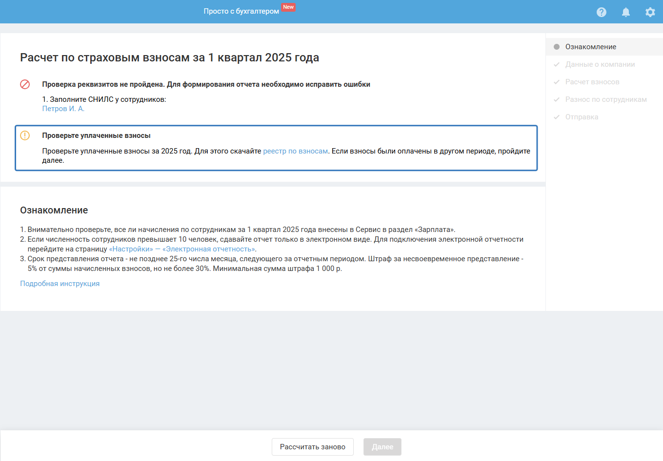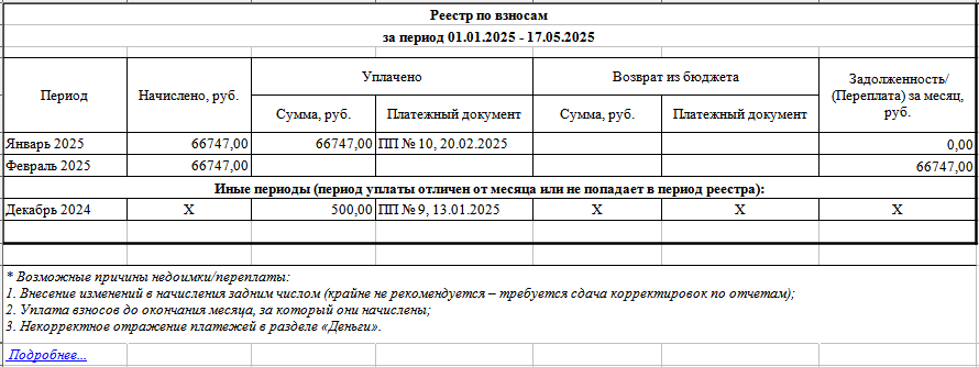 Если за период начиная с января года, за который формируете отчёт, за исключением последнего месяца квартала (за который формируете отчёт), имеется задолженность по уплаченным взносам, то будет выведено предупреждение о проверке уплаченных страховых взносов, также вы можете скачать реестр по взносам: