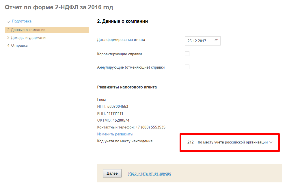 Кроме того, на данном шаге представлена общая информация, которая может понадобится при сдаче корректирующих, аннулирующих справок, а так же при предоставлении отчетов по обособленным подразделениям организации (местам ведения деятельности ИП на ЕНВД, Патенте).