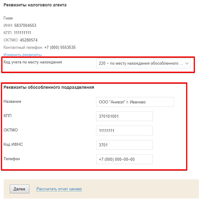После того, как отчет по головному отделению отправлен, сформируйте отчет по обособленному подразделению. Для этого на Шаге 2 в поле "Код учета по месту нахождения" выберите код "220". В появившемся блоке "Реквизиты обособленного подразделения" последовательно заполните все поля, касающиеся реквизитов обособленного подразделения и налоговой инспекции, в которой оно стоит на регистрационном учете: