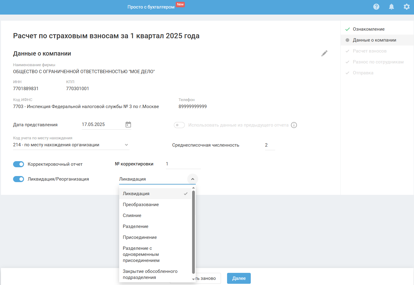 Отметьте галочкой, если у вас ликвидация или реорганизация. При реорганизации необходимо выбрать её тип из выпадающего списка. Если ваша компания ликвидируется в апреле 2023 года, следовательно, поставить галочку нужно в отчёте за 1 полугодие 2023 г. до наступления срока сдачи данного отчёта.