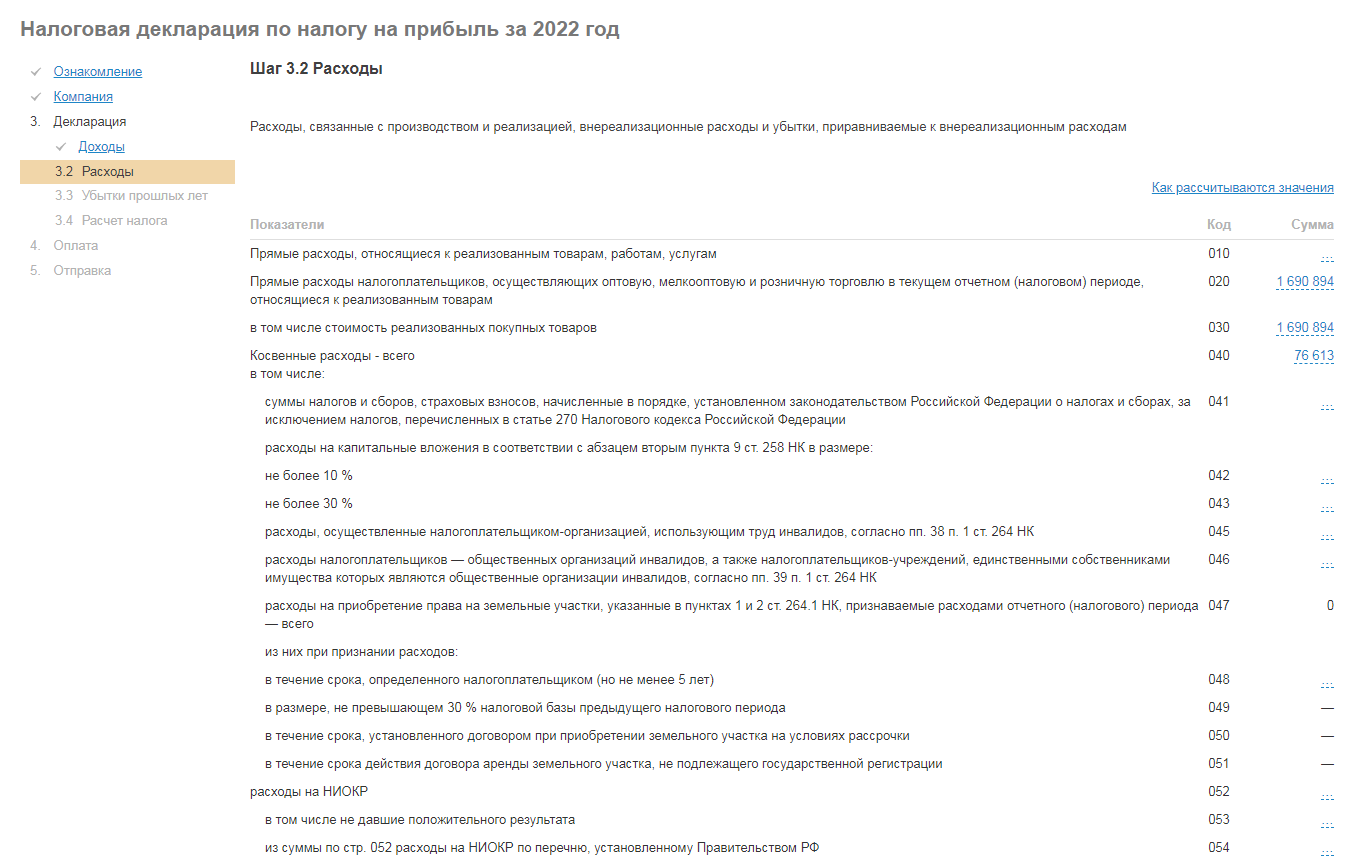 На шаге отображается информация о расходах, понесенных организацией в отчётном периоде.