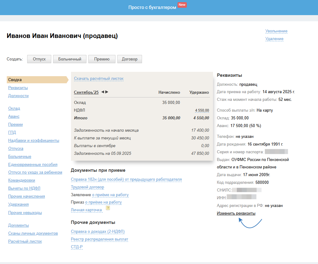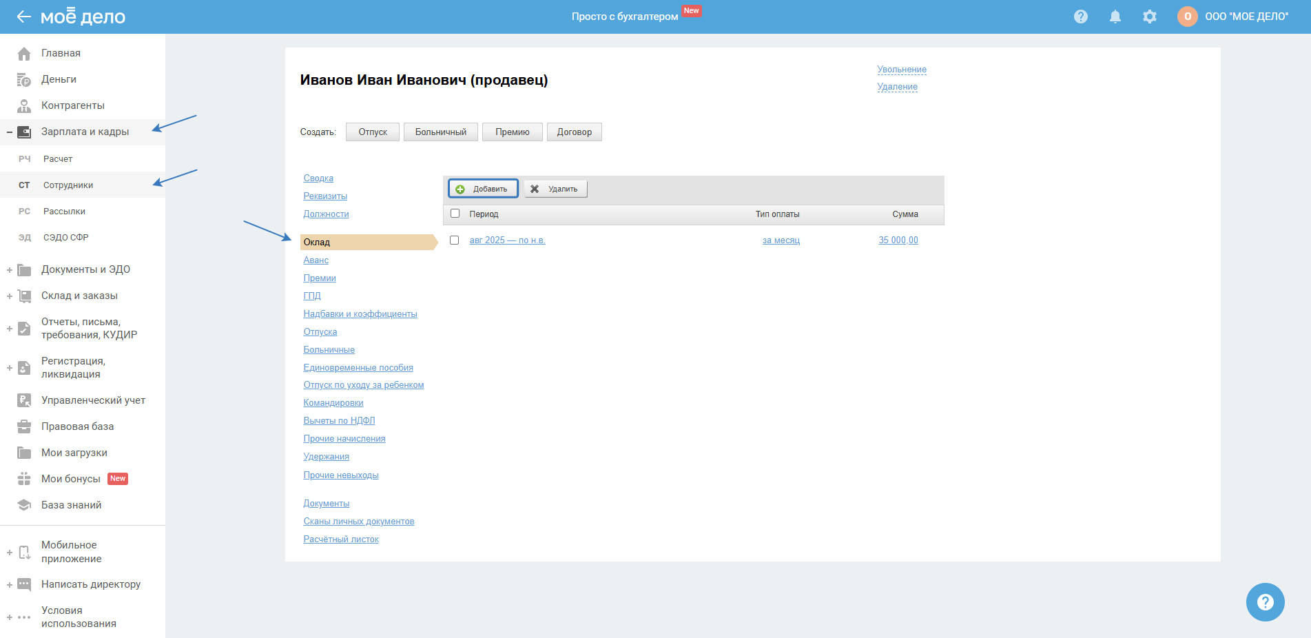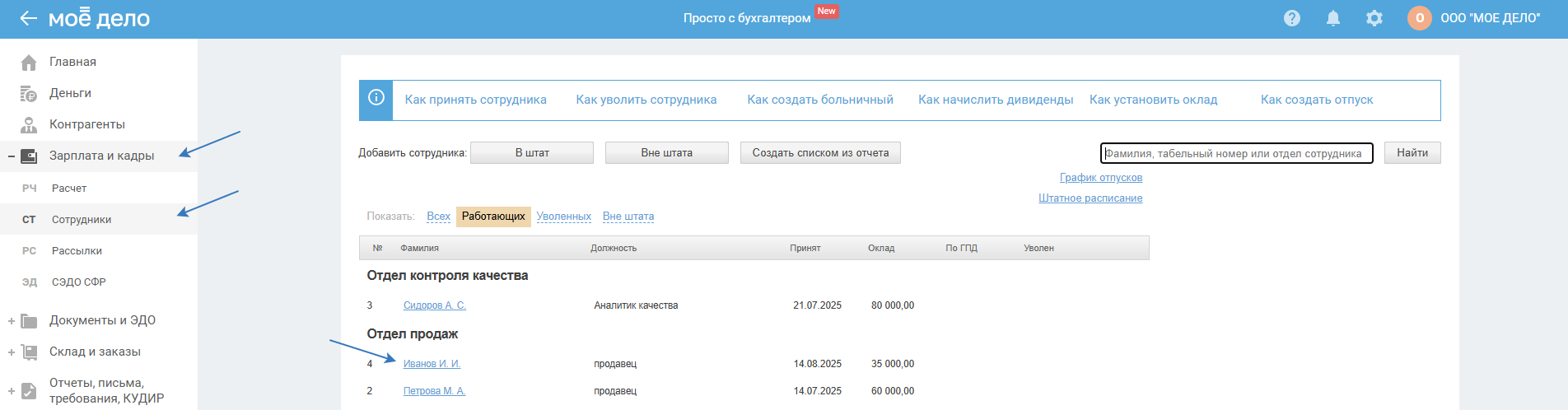 1. Перейти в раздел «Зарплата и кадры», вкладка «Сотрудники», нажать на ФИО сотрудника: