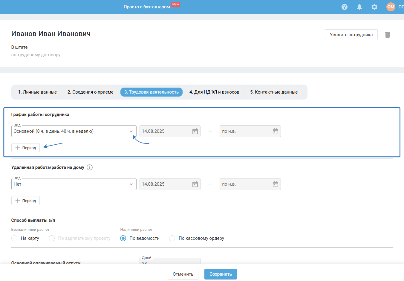 3. В реквизитах сотрудника на шаге 3. Трудовая деятельность в поле «График работы сотрудника» нужно нажать на кнопку «+ Период» или отредактировать уже имеющийся график:
