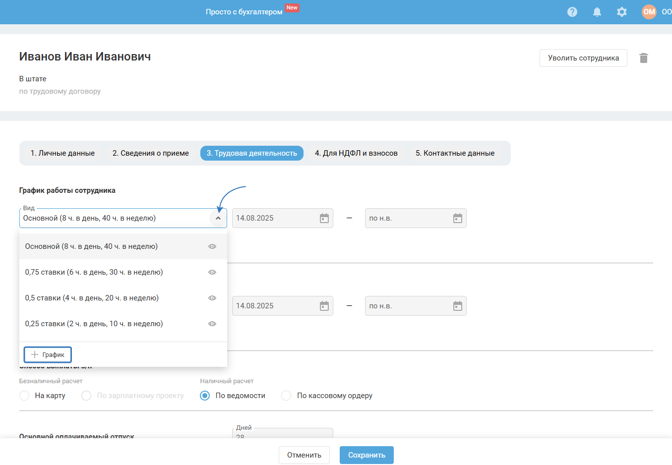 После сохранения графика работы следует выбрать размер оплаты труда: