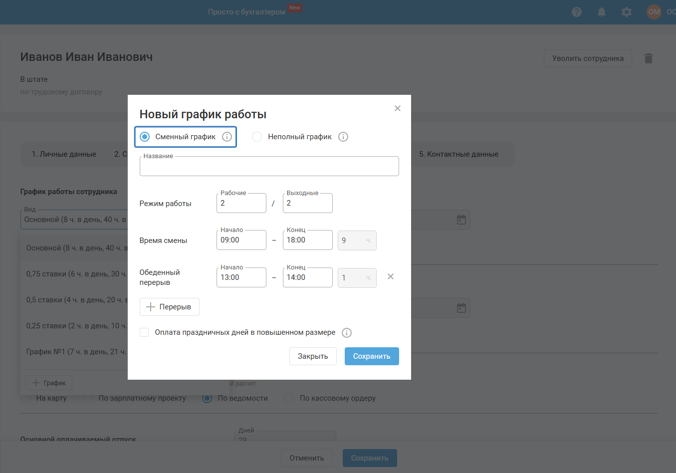 Расчёт заработной платы сотрудника, которому установлен сменный график работы, зависит от способа оплаты, выбранного в разделе «Оклад».