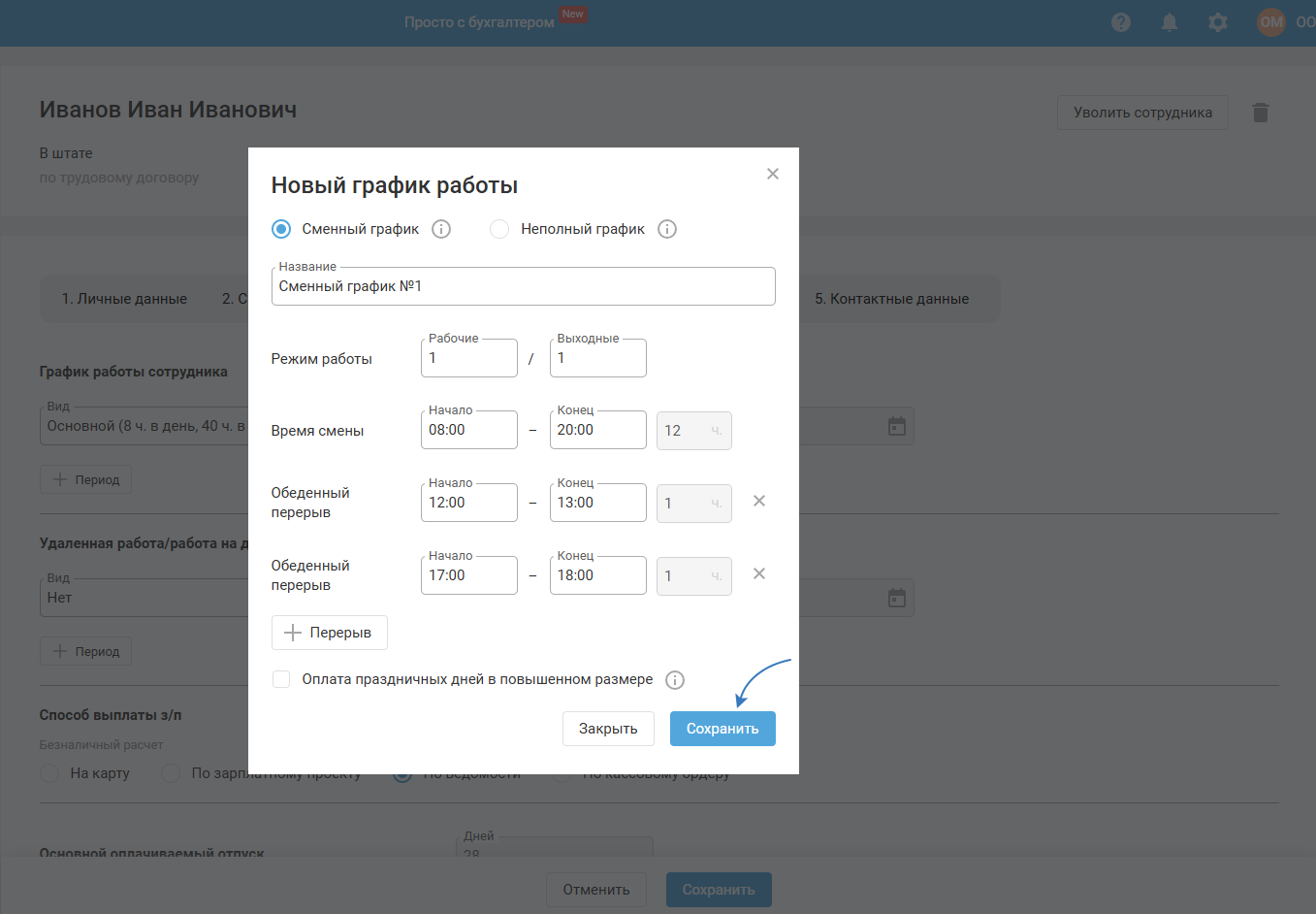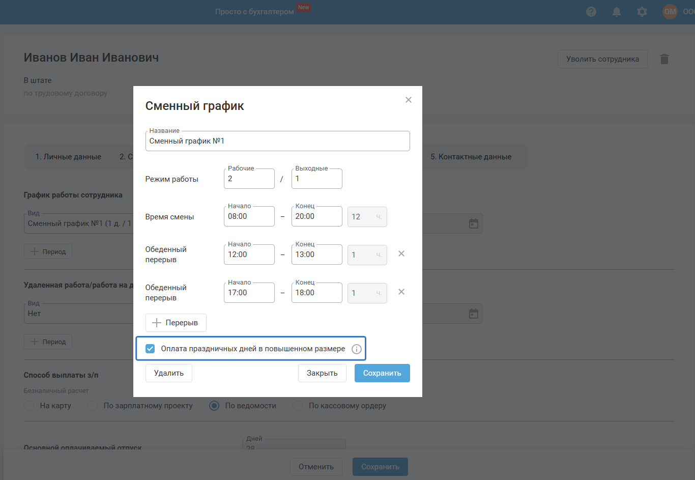В сервисе доплата за работу в праздники начисляется только сотрудникам, работающим на сменном графике.