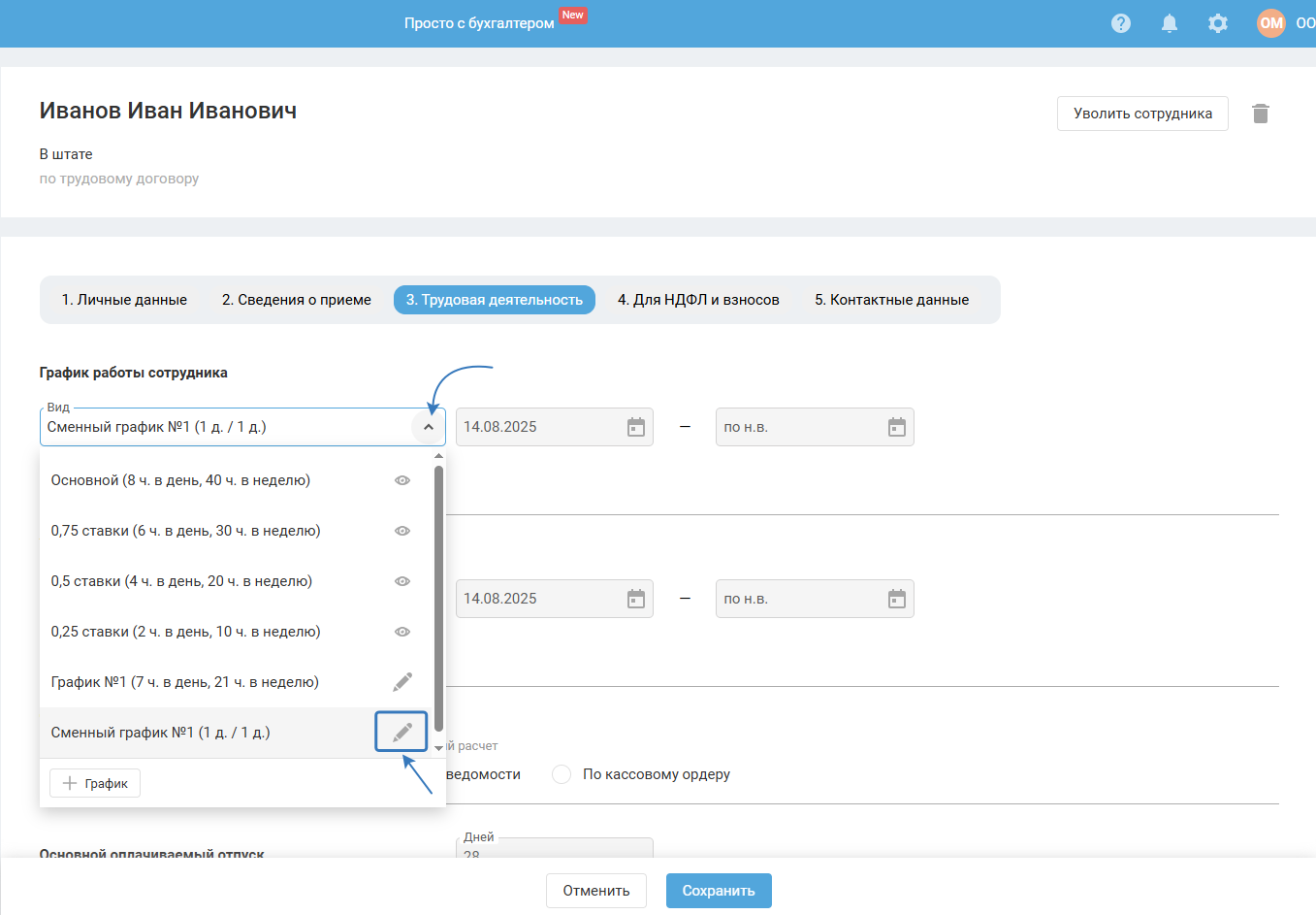 Для того чтобы установить сменный график работы сотруднику, необходимо: