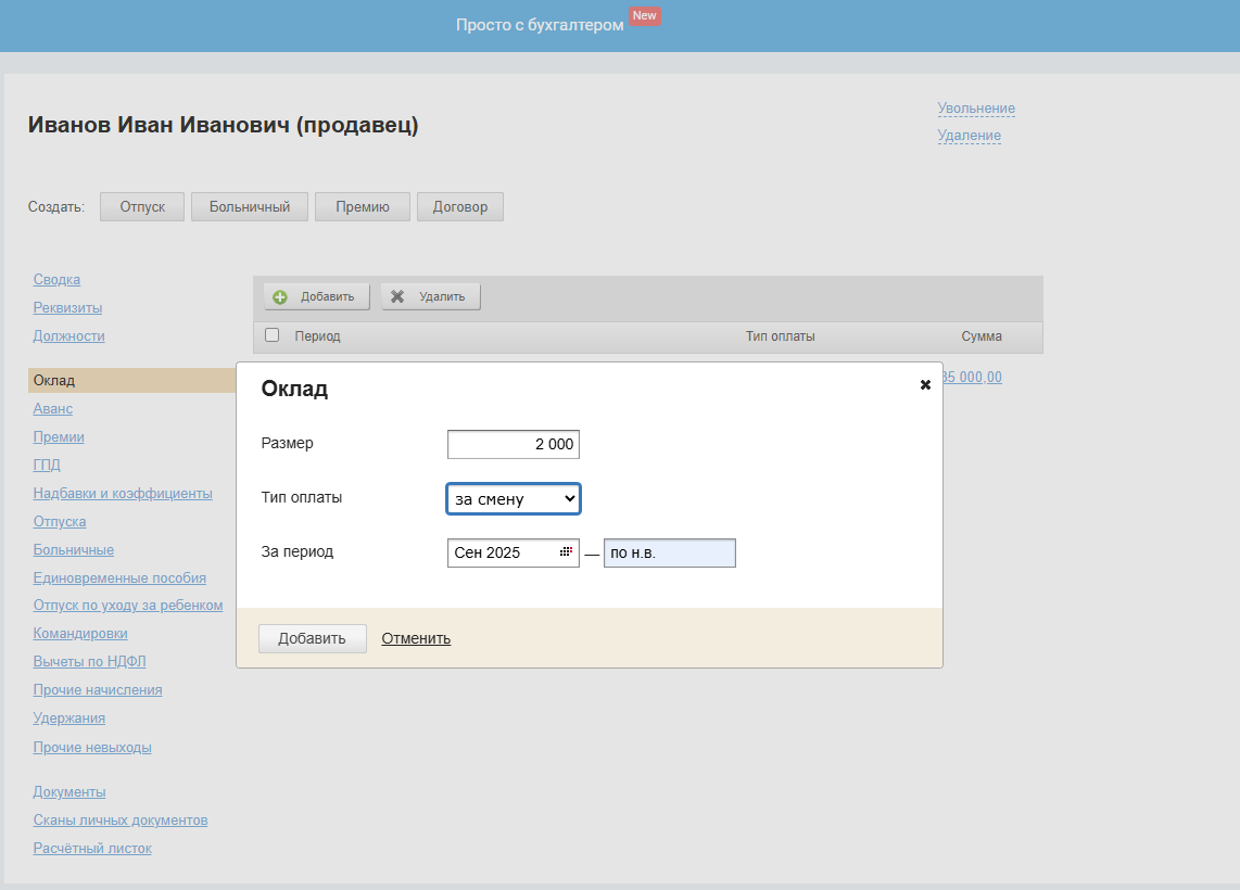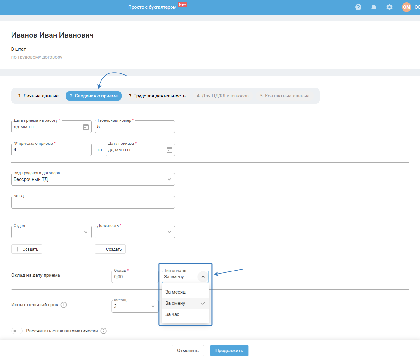 При добавлении нового сотрудника в штат способ оплаты (за месяц, за смену, за час) можно указать непосредственно в реквизитах сотрудника на шаге 2. Сведения о приёме в поле «Тип оплаты». Размер и способ оплаты труда сотрудника будет автоматически транслирован на страницу «Оклад».